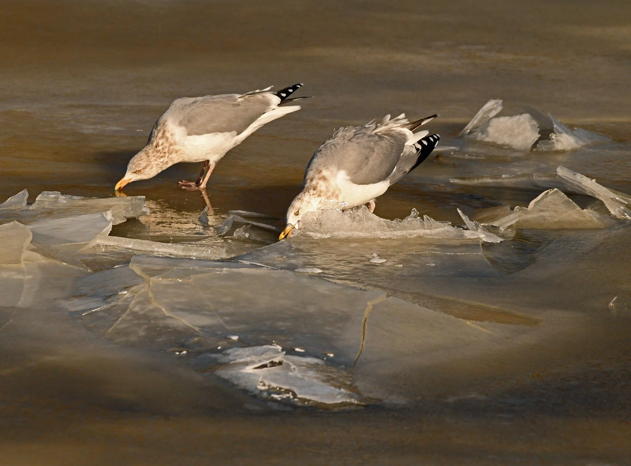 Here you see seagulls (two herring, one ring-billed) about to quench their thirsts in a small pond of melted ice water atop sea ice.