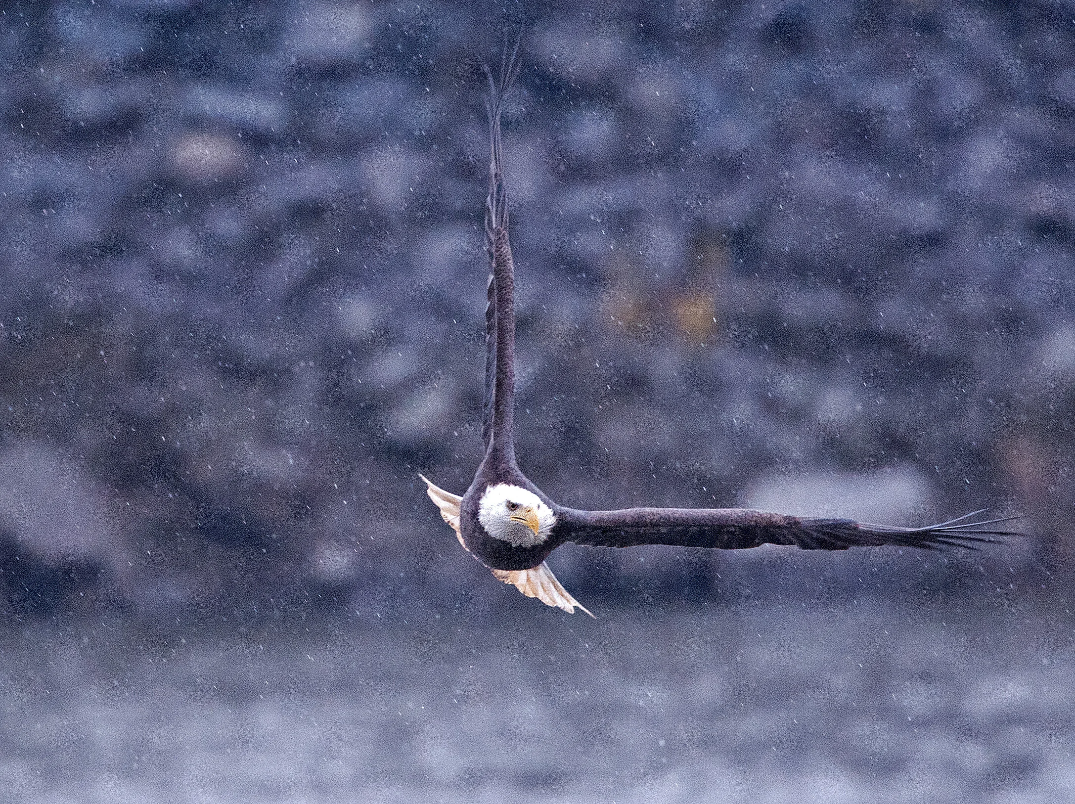 The Bald Eagles are feeding! They swoop in and out of the dank shadows like avenging harpies, slowly beating their massive wings in the heavy air. It’s a dream scene: slow motion beauty and grace within a nightmarish landscape.