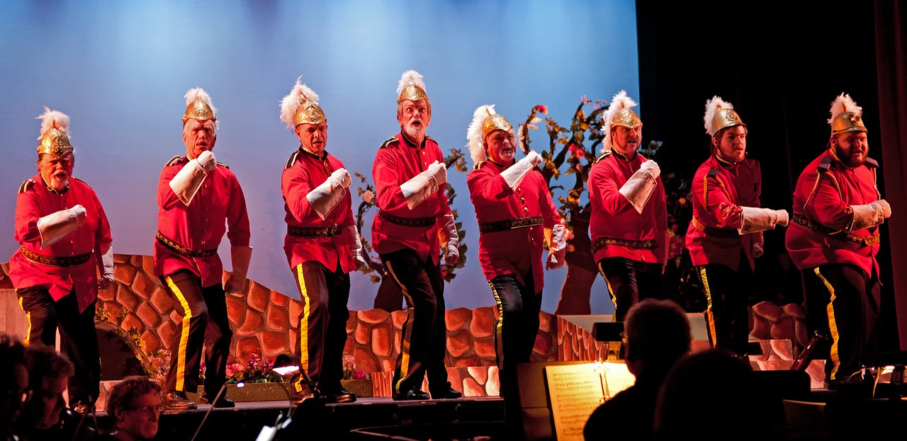 There also are cast members who have retired from their day jobs, but have never retired from the music world. For example, neighbor David Porter, who plays one of the maiden-seeking Dragoons in Patience, was a professor at the University of Georgia (as was his singing wife, Jean); David also gives community lectures on mushrooms and other fungi.