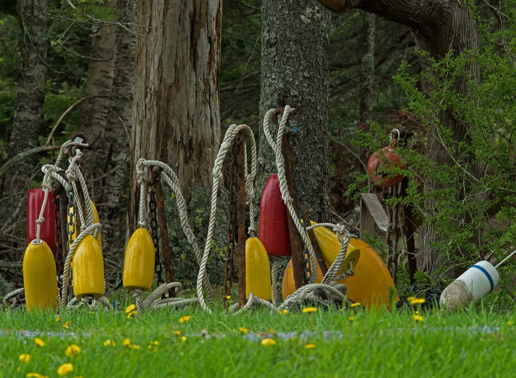 This variety of mushroom is a several-hundred-pound anchor with a large chain to which a heavy rope is attached, to which a lighter rope and a bright mooring buoy are attached. These stems are being prepared to submerge in Great Cove, where graceful sailboats will be attracted to the colorful, bobbing buoys like hummingbirds to honeysuckle. (Brooklin, Maine)