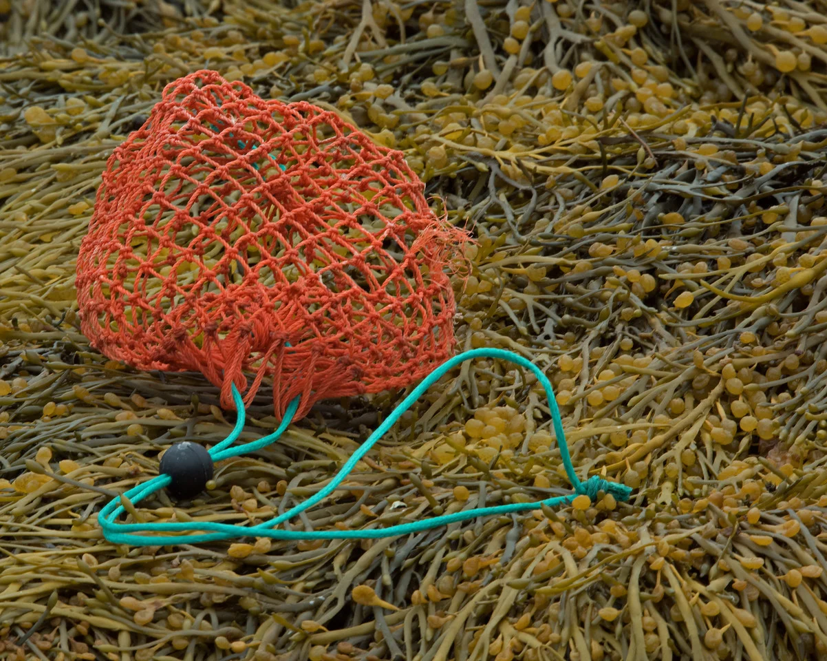 This is No. 136 in our Abstract Reality Series, another example of Mother Nature’s talent in composing beach art from flotsam. In the real world, however, it’s a lost bait bag that has washed up on sea weed.