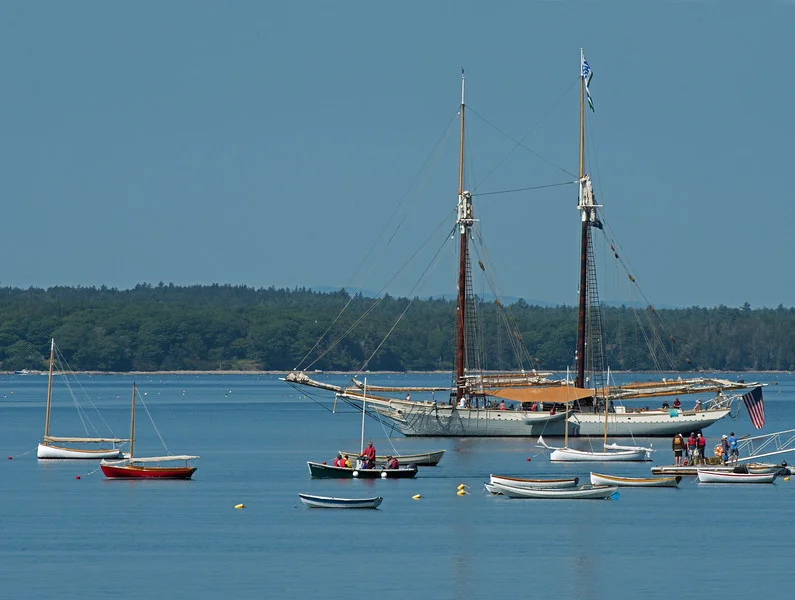WoodenBoat School students are being ferried to their small sailboats on a School skiff; soon, they’ll raise sails and hunt for wind. A yawl boat on the Mary Day is being hoisted up while the schooner’s tarpaulin is coming down; the 125-foot windjammer’s own sails will be raised one by one next and she’ll sweep out into Eggemoggin Reach. (Brooklin, Maine)