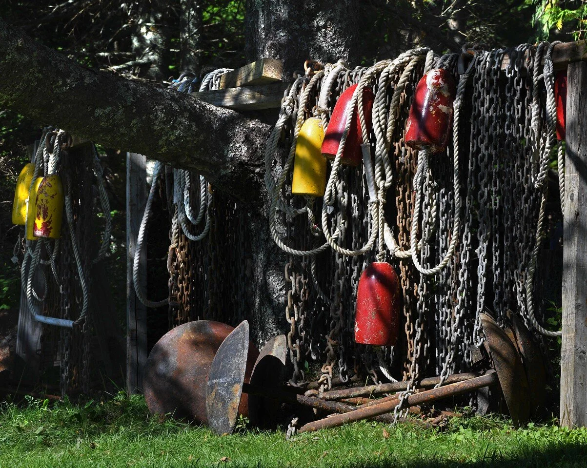The boats’ impermeable mooring gear – mushroom anchors, chains, lines, floats, and the like – also is being pulled and winched from the water and washed. But, it’s hung from outside timbers like the jewelry of giants.
