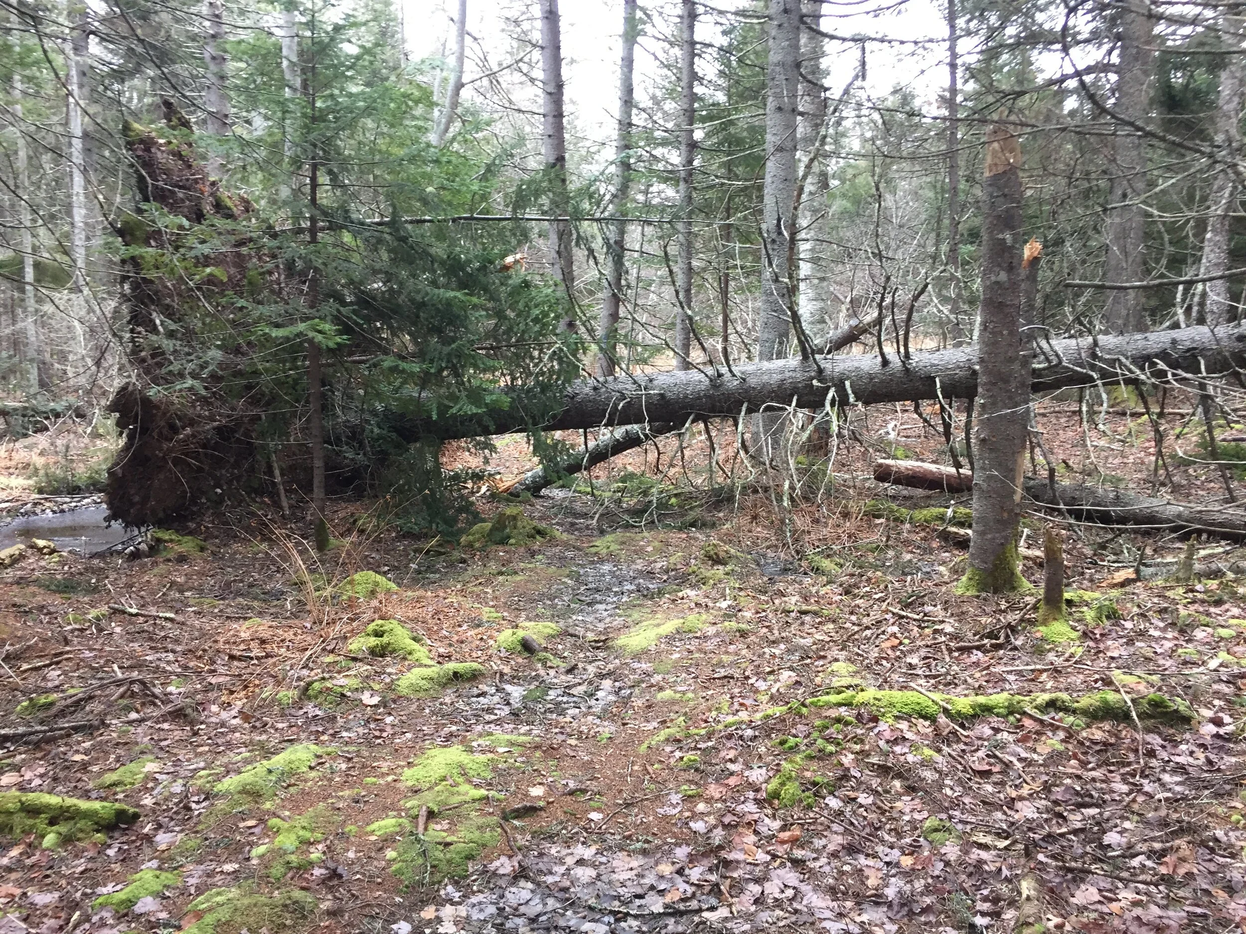 One of our locally prized red spruces died an inglorious death earlier in the week. Pounding rain, high winds, and ground-thawing temperatures got it rocking uncontrollably; one of its sways went too far and the 85-footer blew down, ripping an almost 20-foot-diameter root plate from the ground. It splayed in an ungraceful, seemingly embarrassing, position across a trail used by local hikers and wildlife.
