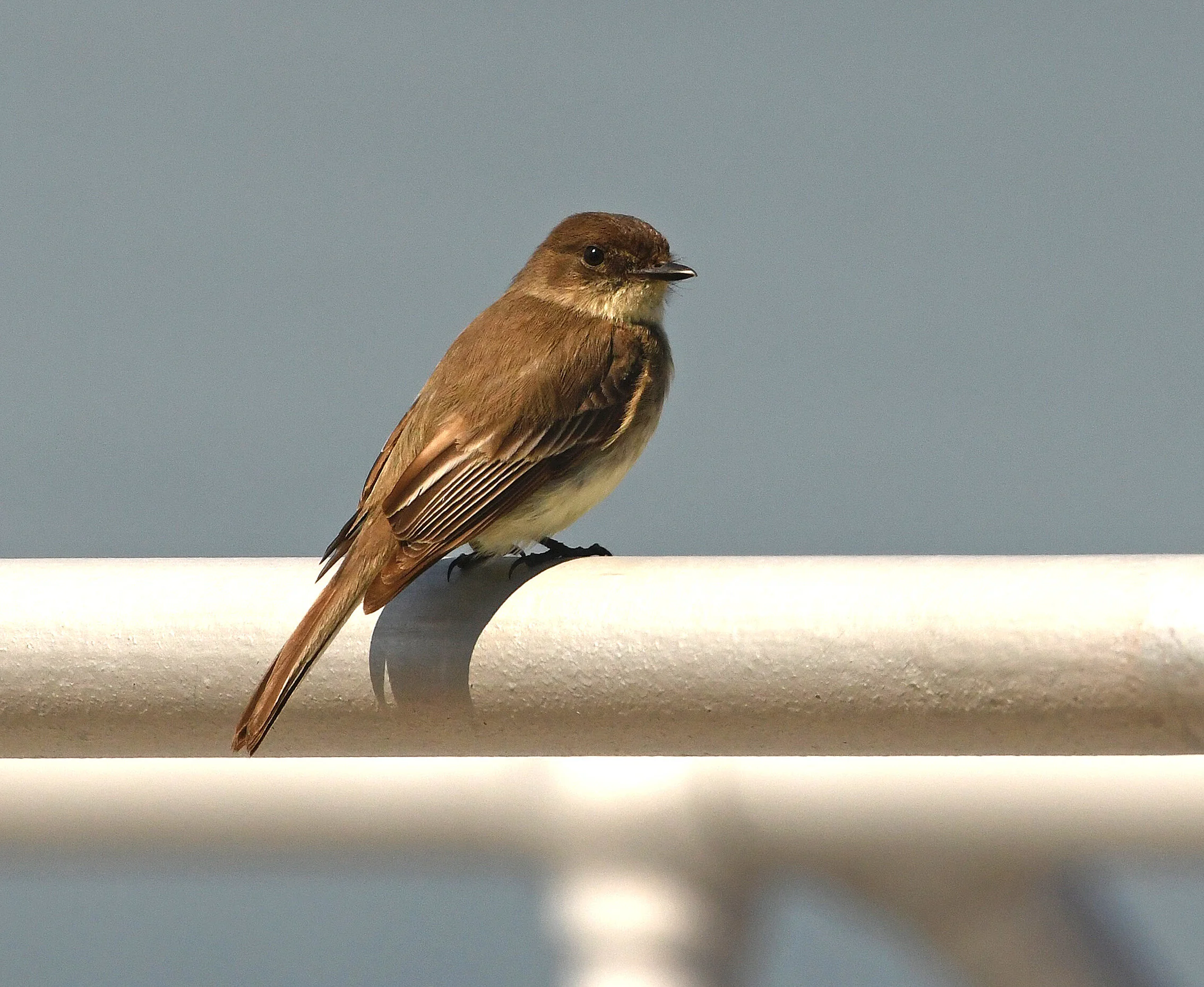 Is that one of those famous birds? Let’s see: About seven inches long? Check. Gray-brown head and back with white belly? Check. No eye-ring? Check. Fly-catching whiskers? Check. White wing bars? Check. Bobbing tail? Check. Raspy voice that keeps repeating its last name? Check. On or near a man-made structure? Check!!!