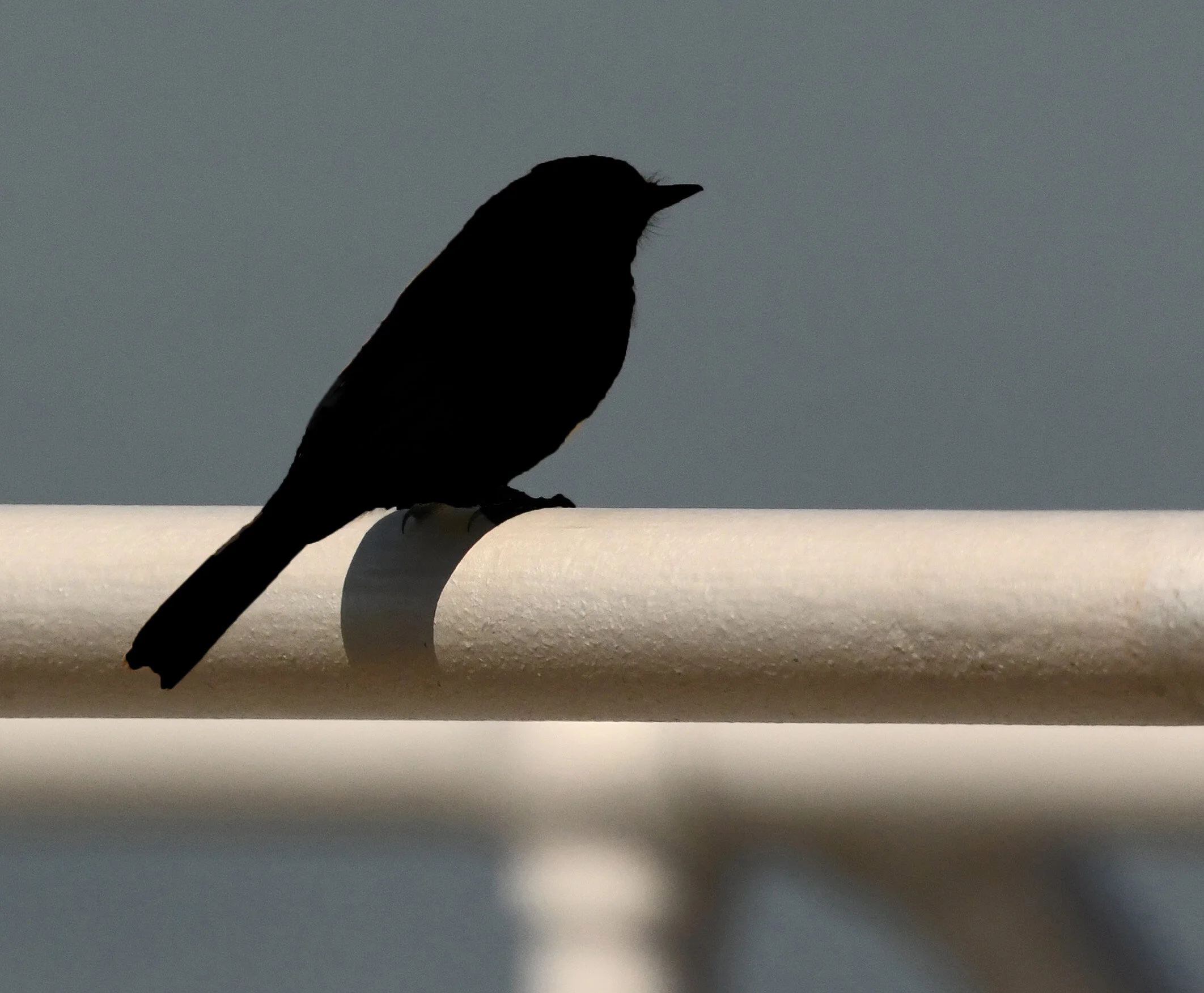 Yes, it’s an Eastern Phoebe, one of our earliest spring migrants and one that builds nests in man-made structures as well as in the woods. He or she (only Phoebes can distinguish a perched him from a her) was taking a rest yesterday on the railing of a pier in Great Cove. S/he and her/his mate had just finished inspecting the underside of that structure for a possible nest site. Here’s a silhouette that we created for identification: