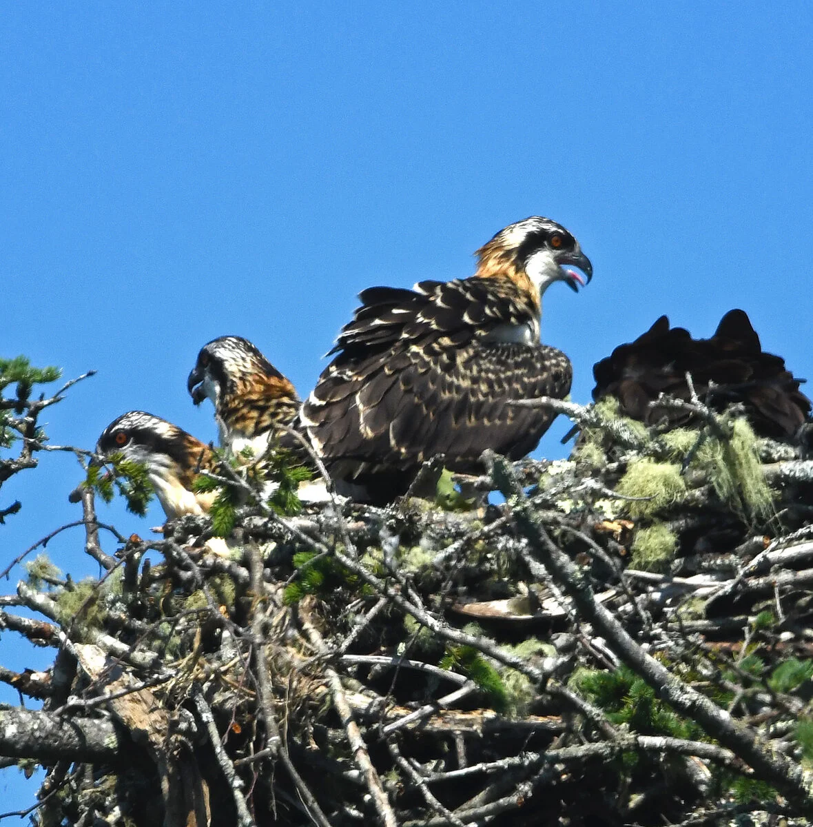 Nonetheless, there is a problem in Eden: the nest that we once thought was so large, now appears a bit too small for the full family to be comfortable, especially while the youngsters walk off their energy and flap their wings. Ozzie still delivers fish there, but he often can’t find a comfortable space and flies back to a nearby spruce top.