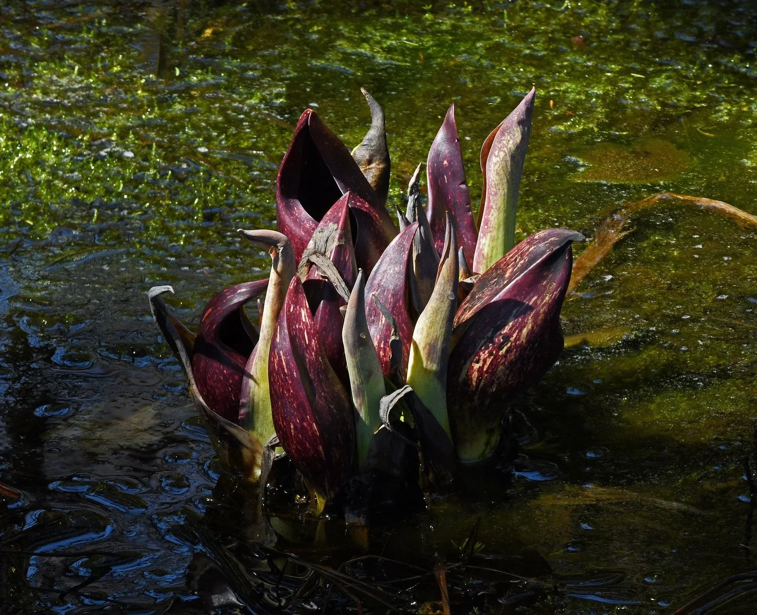 As of yesterday, as you see, this colony of Eastern skunk cabbage (Symplocarpus foetidus) that we’ve been monitoring has not shown any leaf shoots, but its purple spathes appear to be doing well.