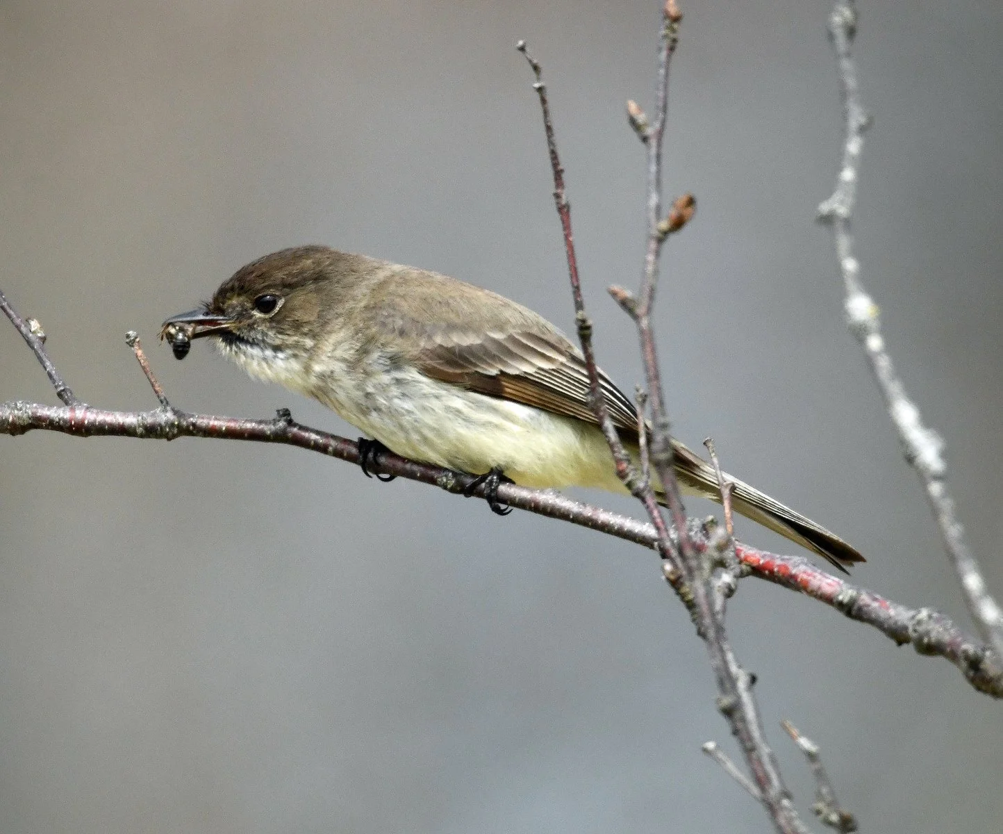 He's a small “flycatcher,” a group of birds that have the amazing ability to catch flying insects on the wing. Here he is eating a hard-to-identify breakfast: