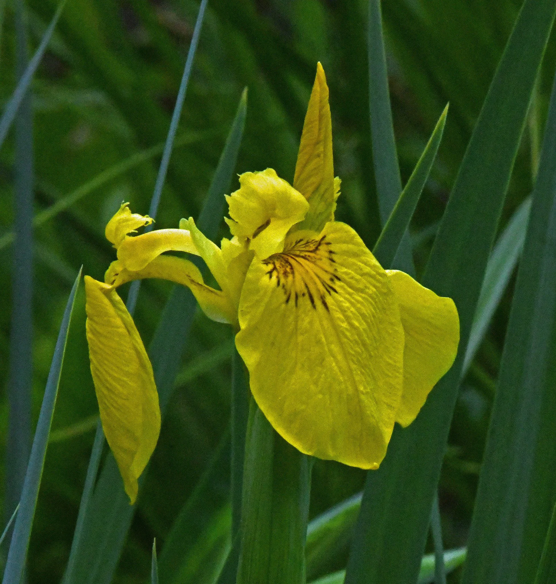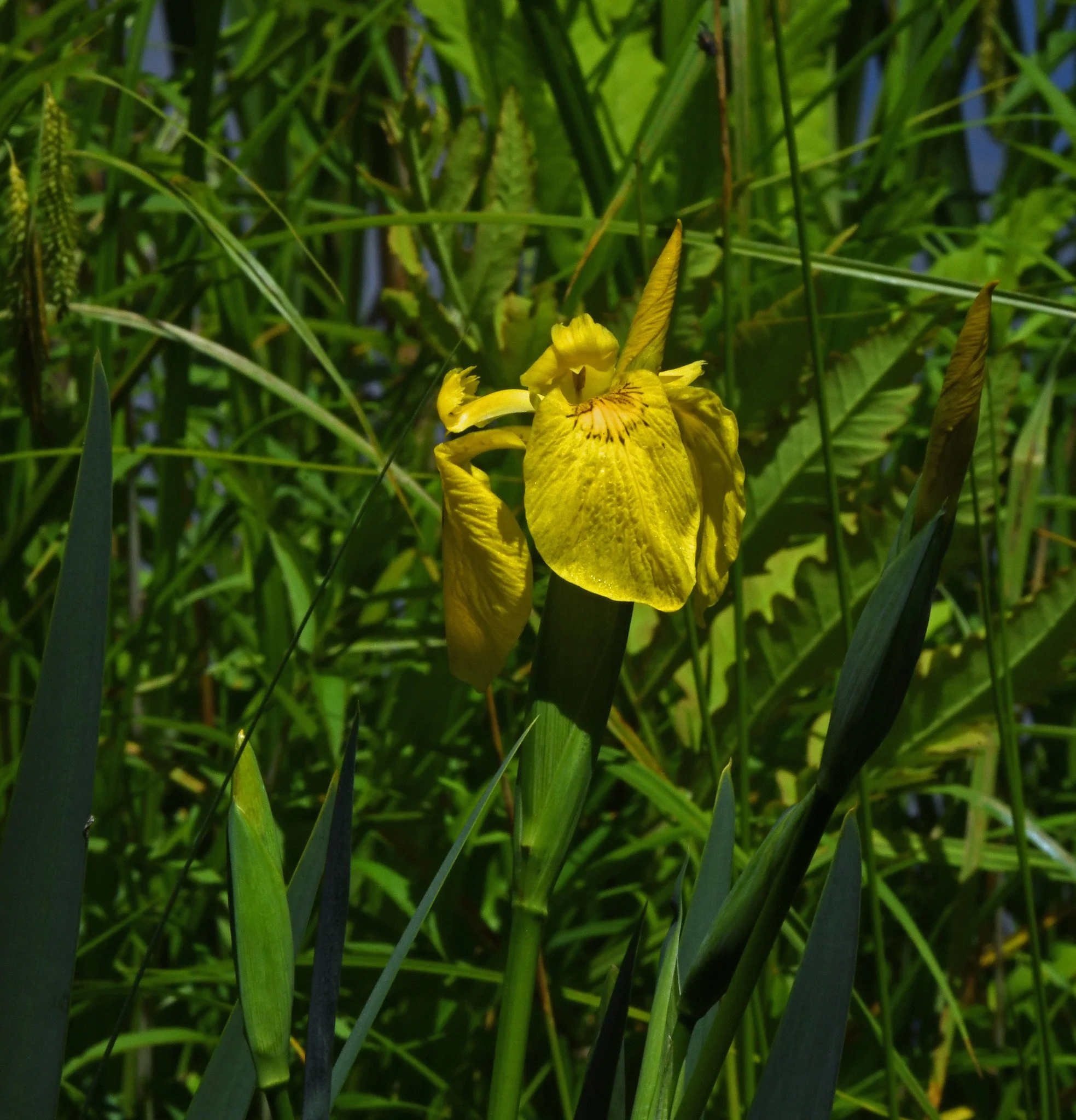 Wild yellow flag iris plants (Iris pseudacorus) have started their short blooming period here in our wetter areas. They’re reportedly the only completely yellow, large wild iris now growing naturally in North America.