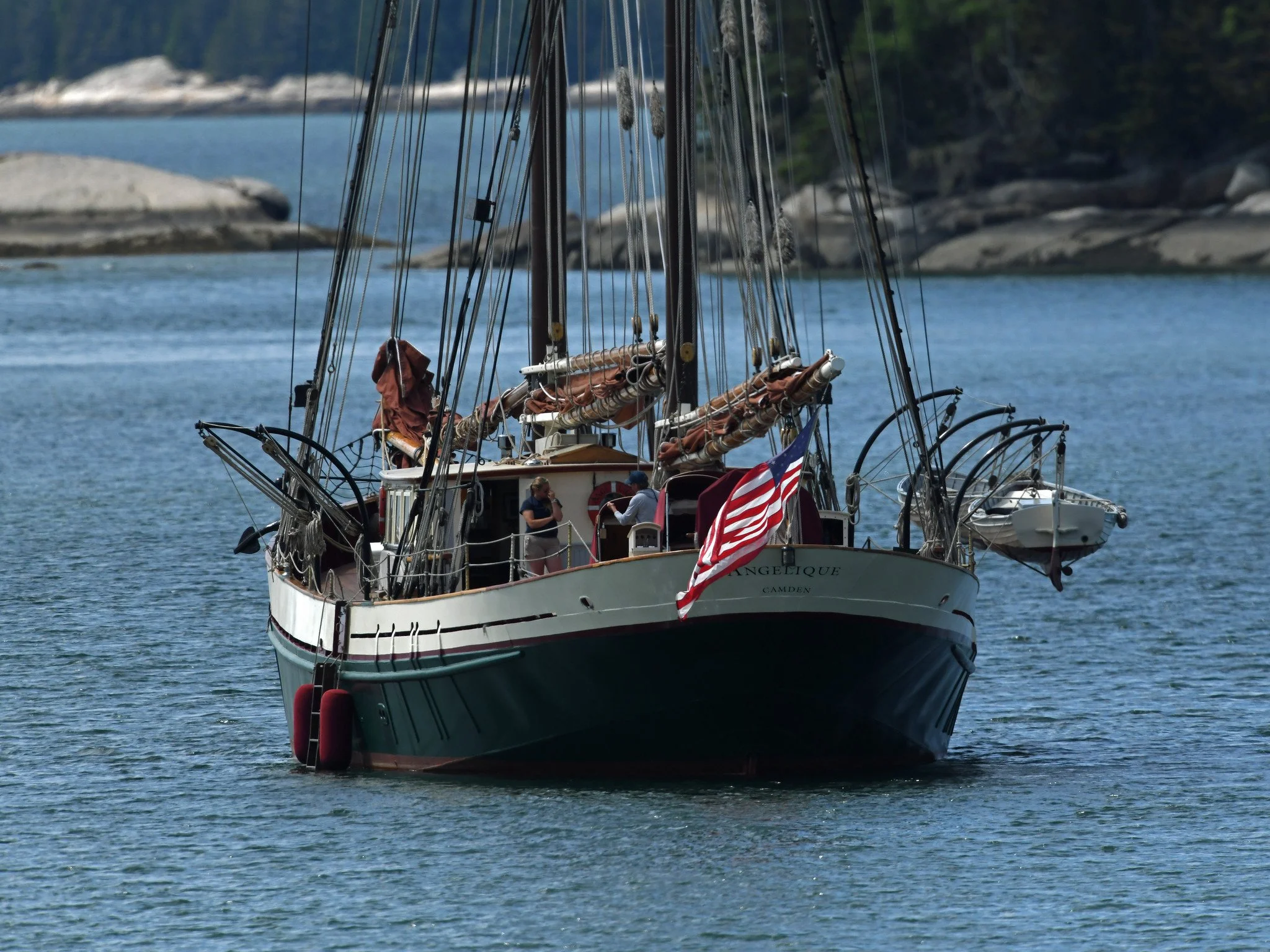 Angelique is 130 feet long overall and the only Maine windjammer that is configured as a gaff-rigged topsail ketch. (Note that, unlike a two-masted schooner, Angelique’s foremast is her main [taller] mast, not her aft mast.)
