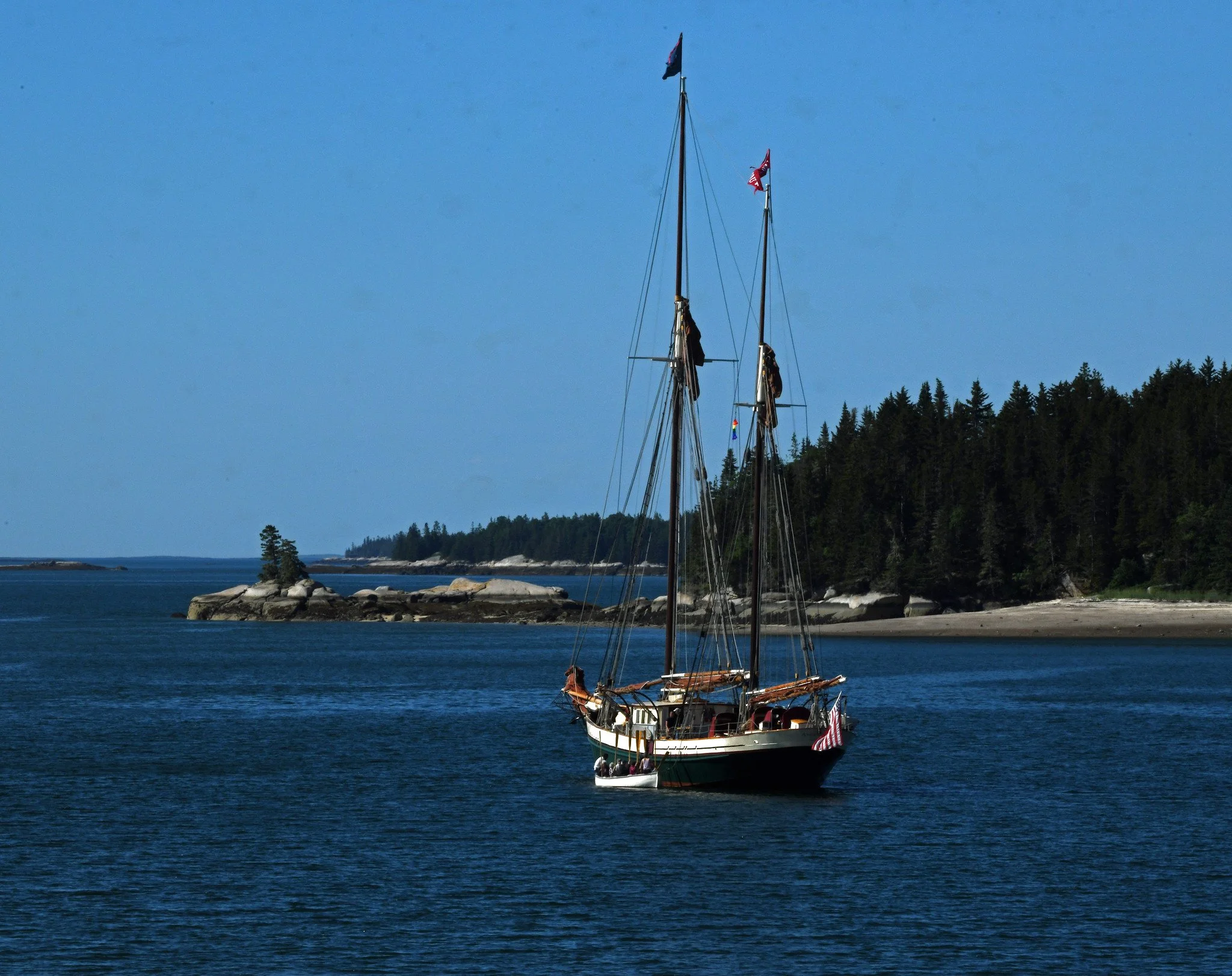 Her “tanbark” reddish sails also are unique in the Maine windjammer fleet. In days of yore, when sails were cotton, they were dipped in vats of tannic acid, tallow, and red ocher, which turned them reddish and protected against mildew.