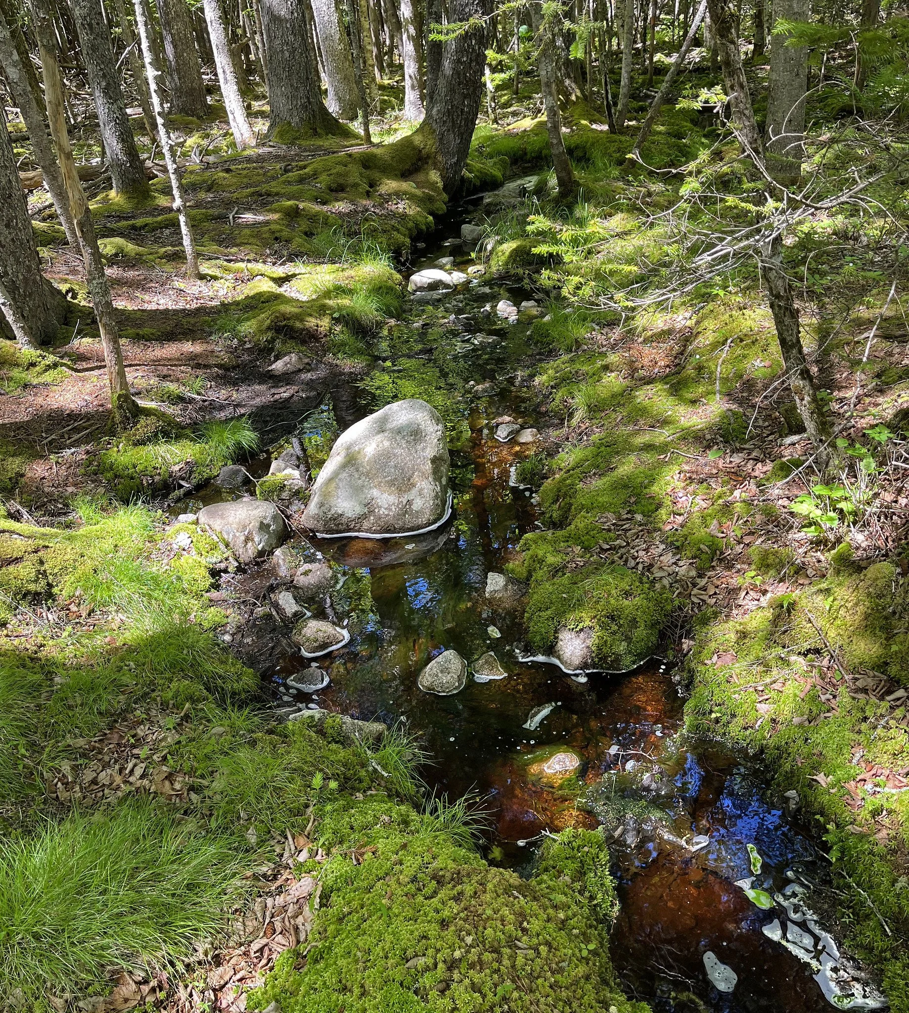 Here you see a usually robust spring-fed stream in the nearby woods as it barely rolled downhill yesterday. Its water volume has been diminishing recently, despite a relatively wet week.