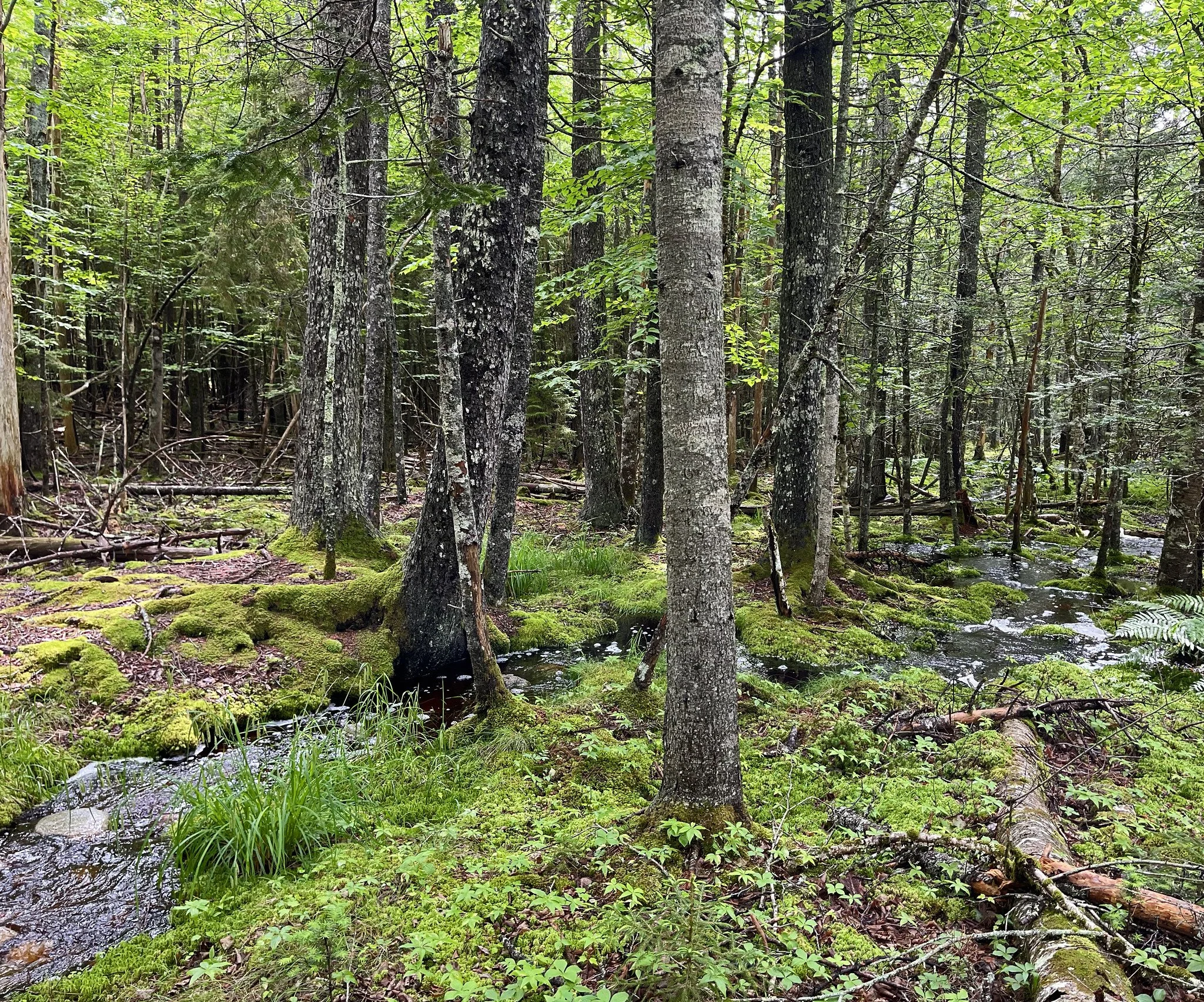 On the other hand, our soil was abnormally dry and our stream flows were low until recently. As you see here, our bogs have returned from drying to pooling and our wooded streams are overflowing. (Images taken in Brooklin, Maine, on June 27, 2023.)
