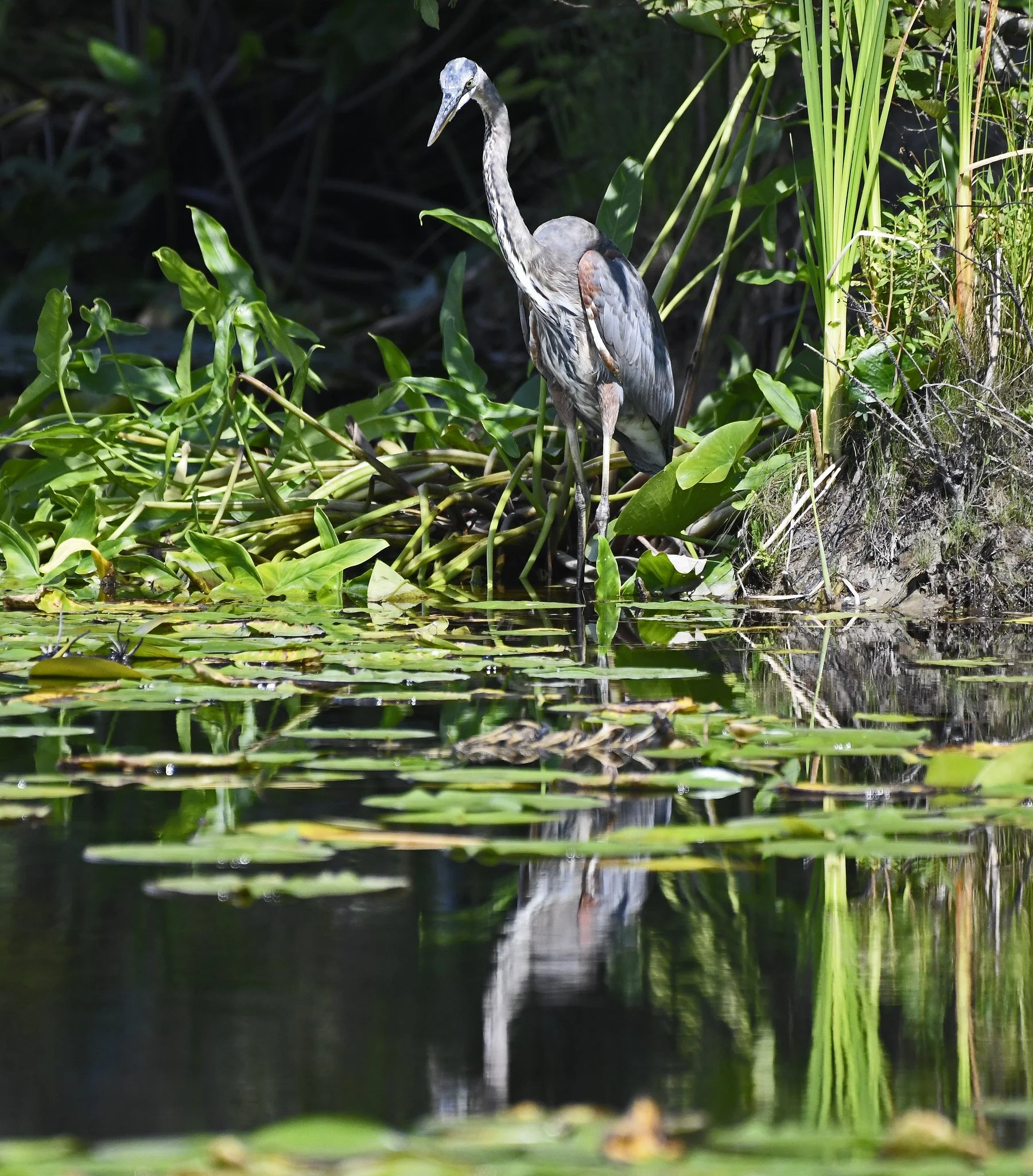 It was a warm day by Maine standards, but this bird didn’t appear to be uncomfortably hot, a state that you often can detect in Great Blues, our largest native wading birds. They principally show heat stress in two ways. First, they’ll stand with their wings down and out to allow cooling air to flow over themselves better.