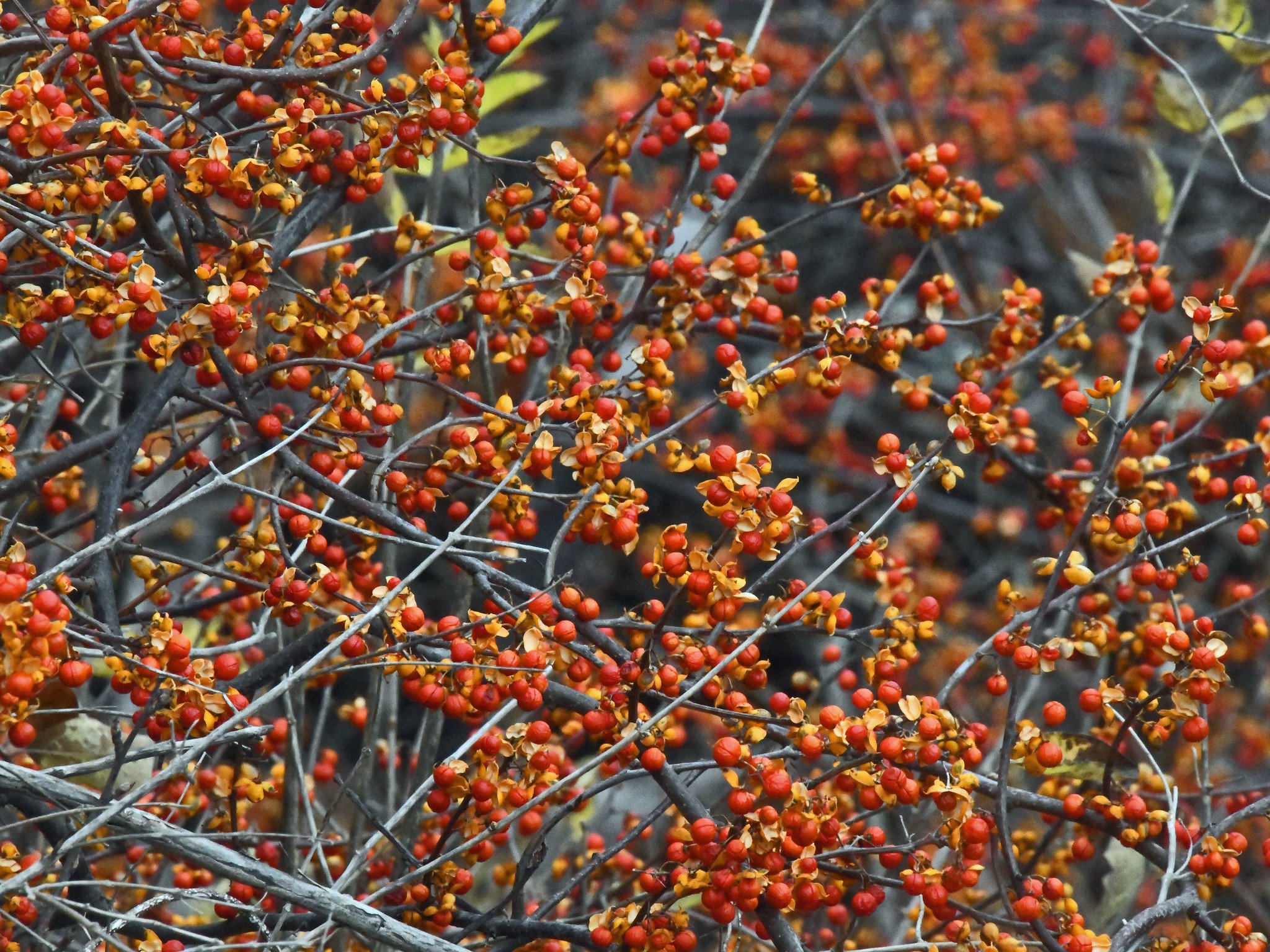 The dryness and absence of really violent winter storms in November delayed leaf-coloring and leaf-falling until late in the month. Much of November was Octoberesque. By the end of the month, however, most of the trees and bushes were virtually leafless (or, in the case of tamaracks [larches] needleless). The leaf loss exposed multiflora rose hips and winterberries for collecting as table arrangements, as well as the cruel beauty of Asian bittersweet fruit on its tree-strangling vines.