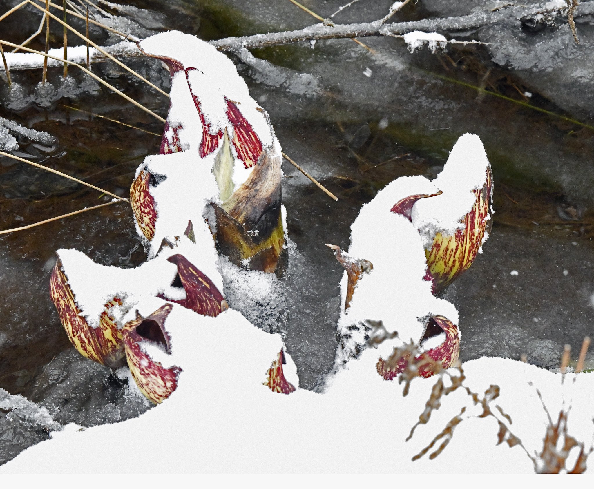 The March flora was more reserved than our streams and rain chain. The American holly, skunk cabbage spathes, and ancient apple trees actually remained quite attractive throughout the month, especially when snow-dappled. Alder catkins and rhododendron buds also made decent spring appearances.