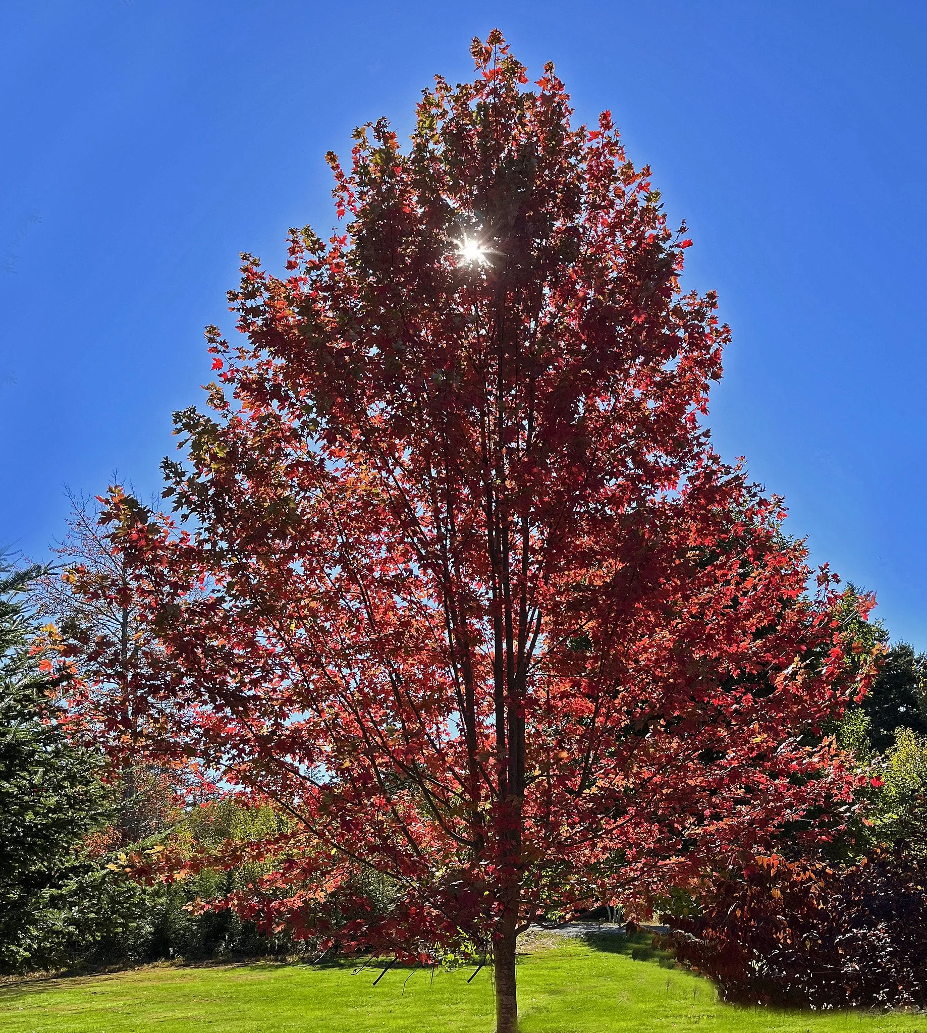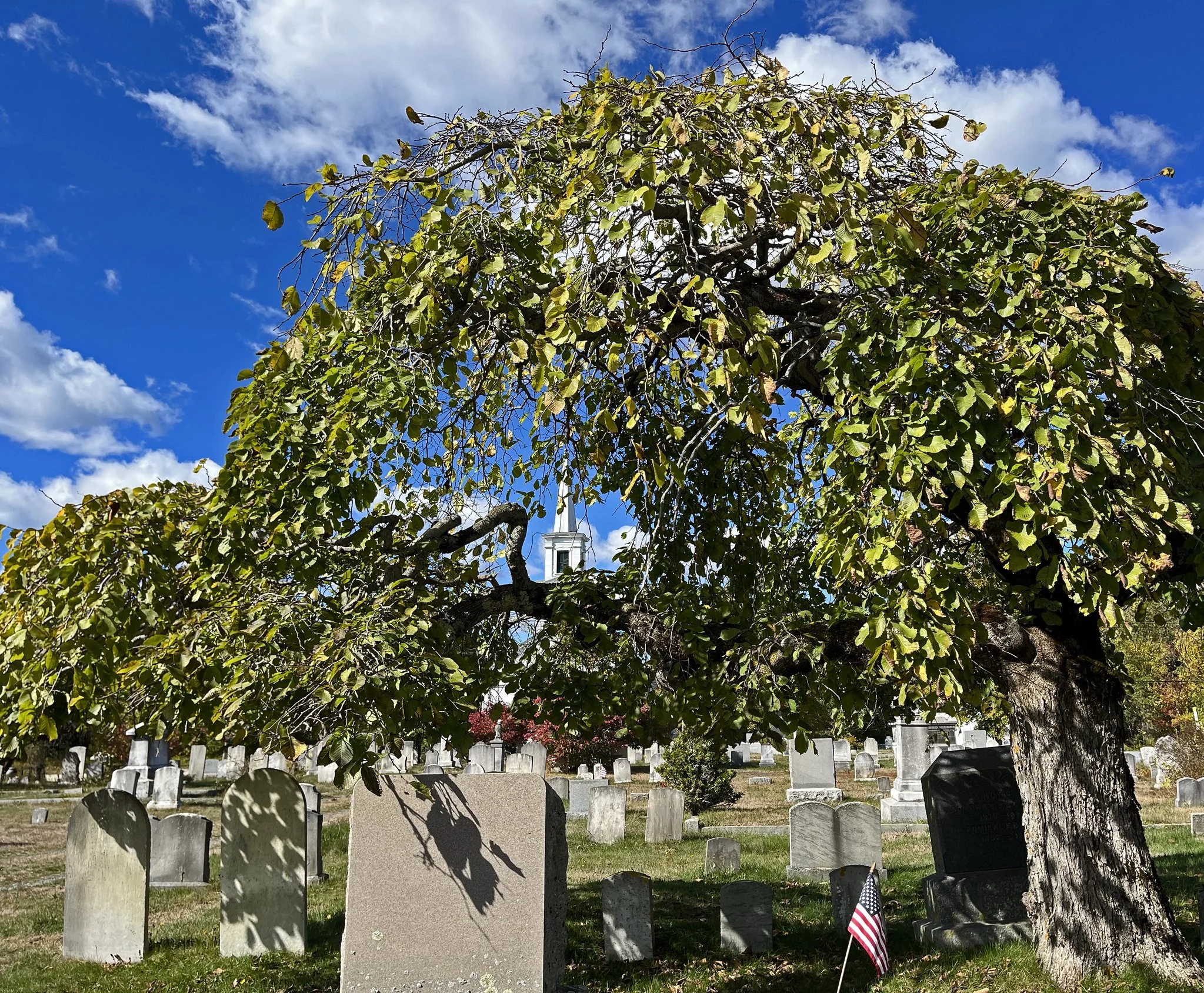 Above, you see a young, glowing red maple, standing straight and true and silhouetted stylishly in the October sun, seemingly daring us to stare at her. Below, you’ll see a very old, seemingly aching, Camperdown elm bending to keep shading her assigned graves from that same sun, while no longer being able to hold her leaves well: