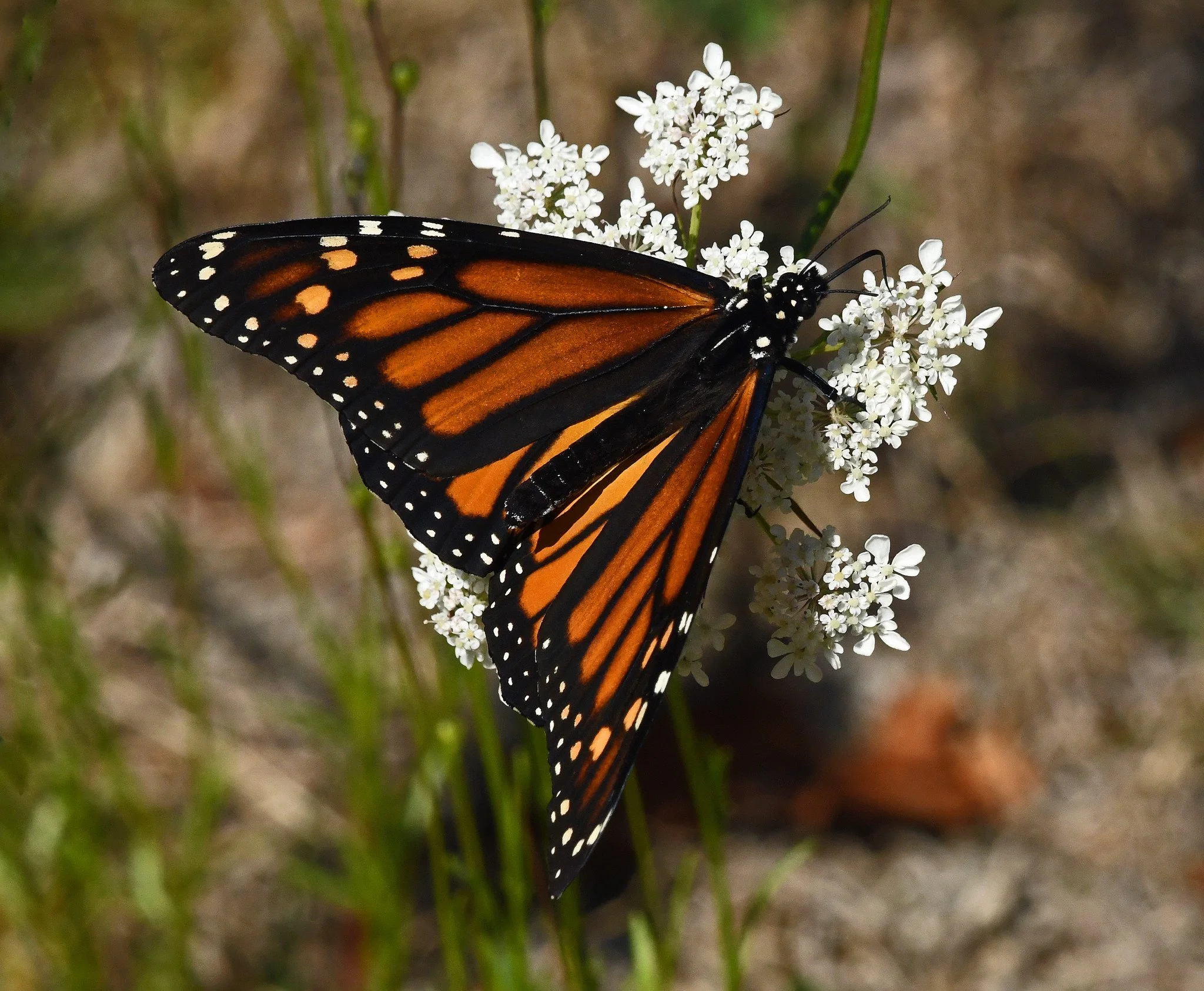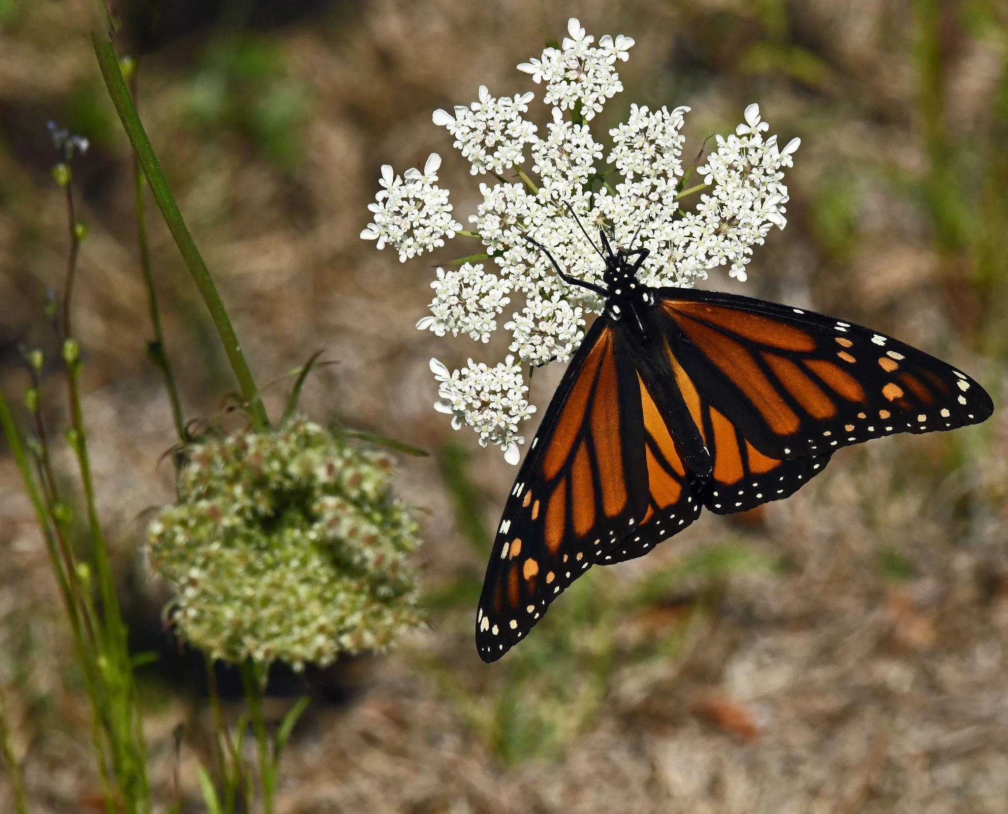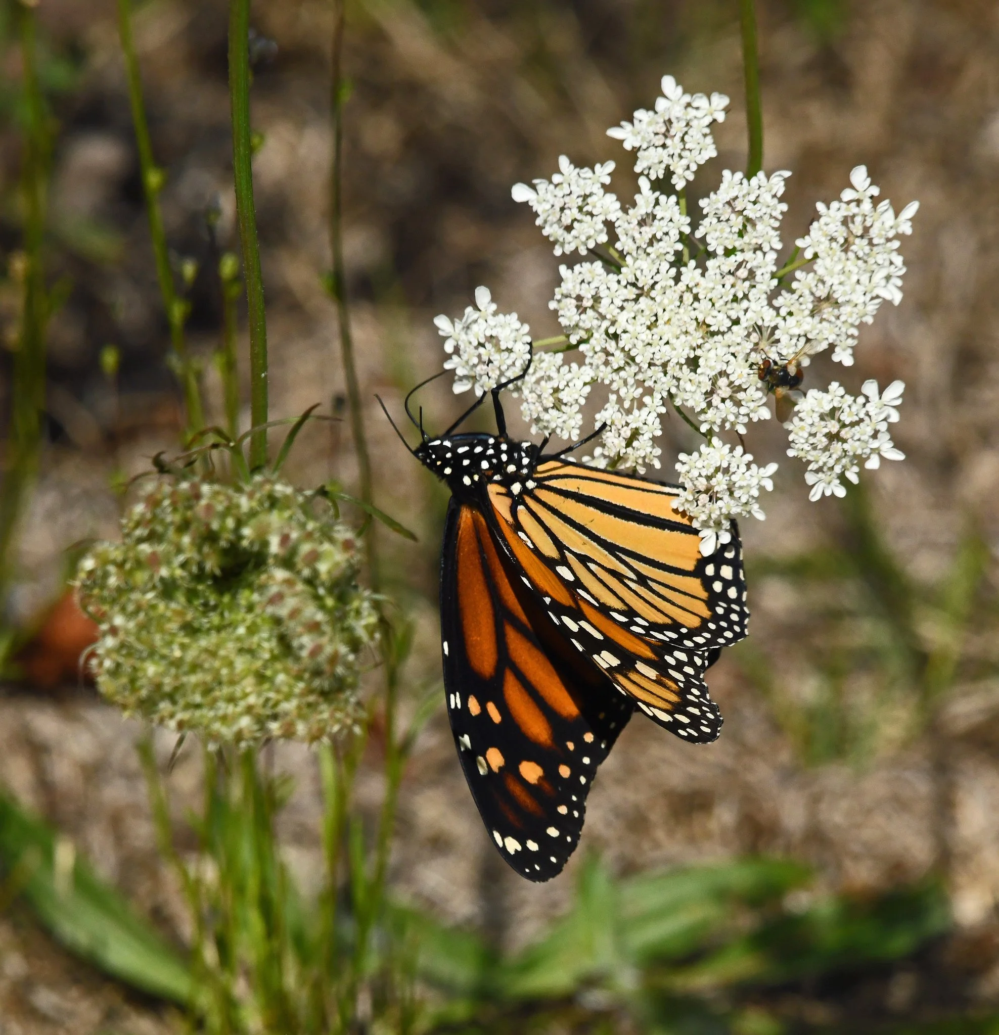 Here we see one of the last royal female insects on one of the last royal female flowers. That’s a female monarch (i.e., queen) butterfly trying to find nectar in a Queen (i.e., monarch) Anne lace flowerhead yesterday when the temperature was 55° (F).