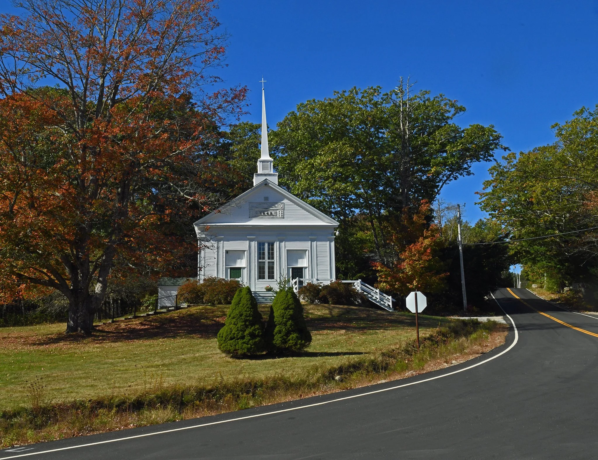 Nonetheless, who would want a large Greek Revival edifice in this setting? This apparently well-maintained church seems appropriate and inviting for a local congregation. It sits there in quiet brightness by a rising rural road in the shelter of tall trees – not proud, but certainly not shy. (Image taken in North Sedgwick, Maine, on October 11, 2025.) Click on the image to enlarge it.