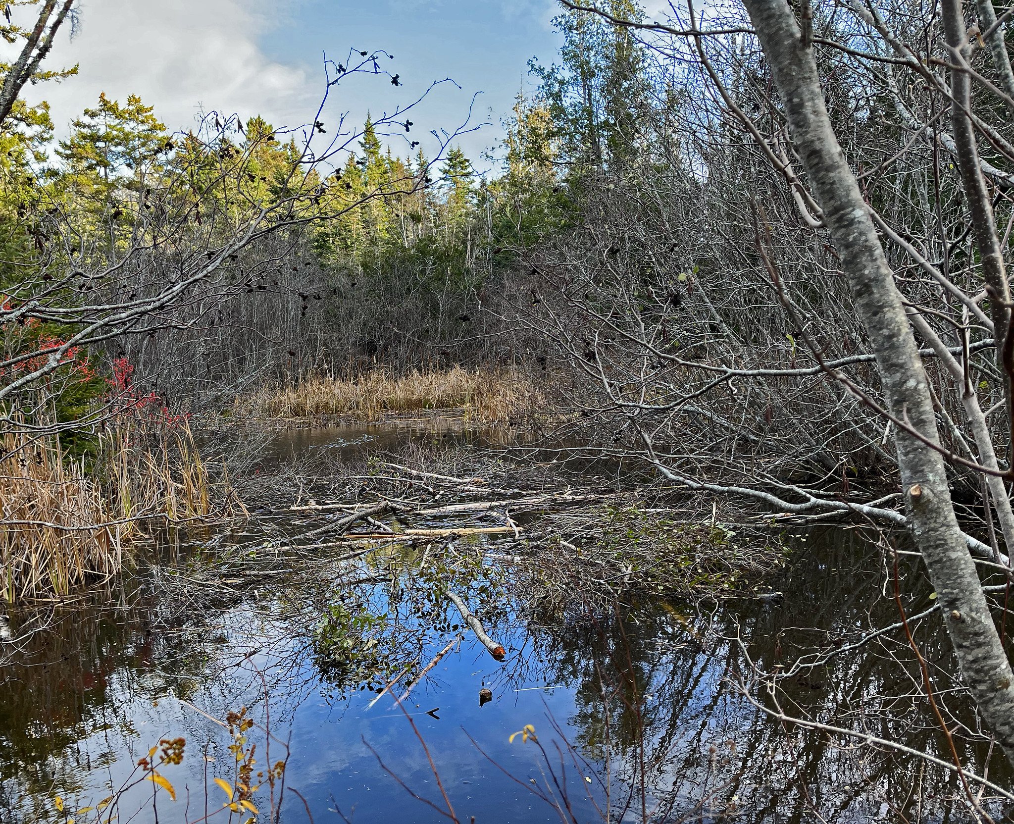 More than 20 trees, ranging in diameter from 1 to 7 inches, have been felled by Bernie since he arrived in late September. He eats the inner bark and keeps his ever-growing teeth from becoming tusks by felling trees. He sometimes uses most of the tree for his lodge, at other times he uses only a small part of it and leaves most of the tree lying there. It looks almost random.