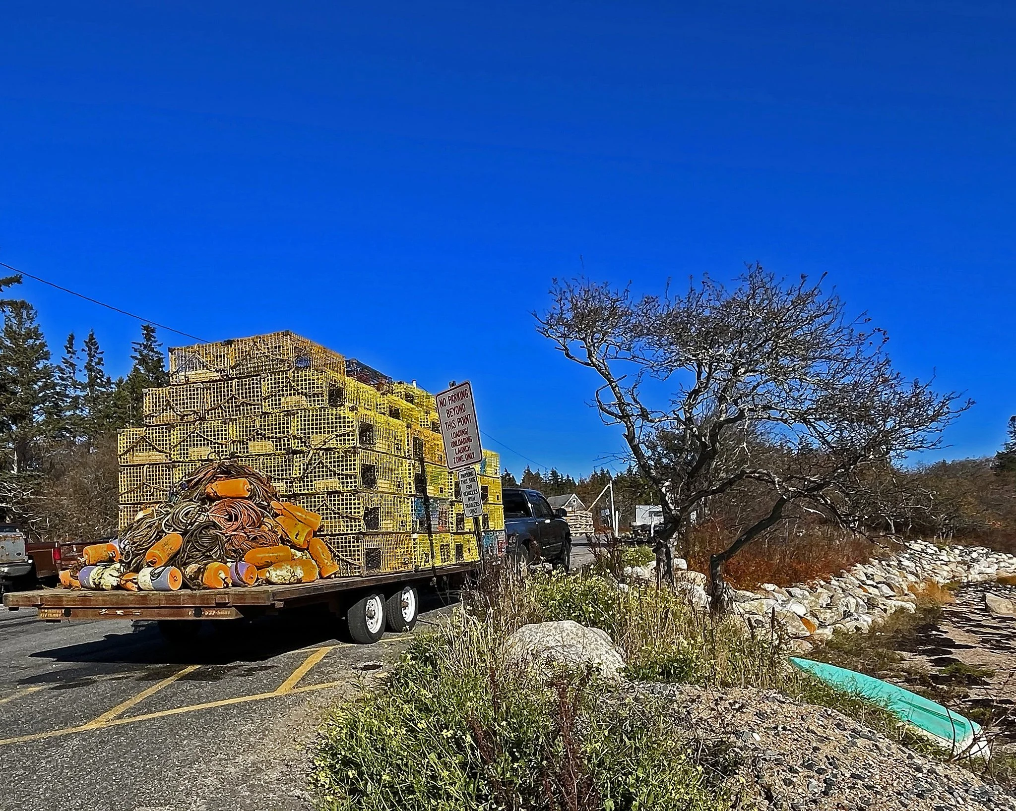 On the working waterfront, November is the time when most coastal lobster fishing ends here. Lobster traps are hauled into the harbors and trailered to storage, while the fishing vessels are prepared for winter.
