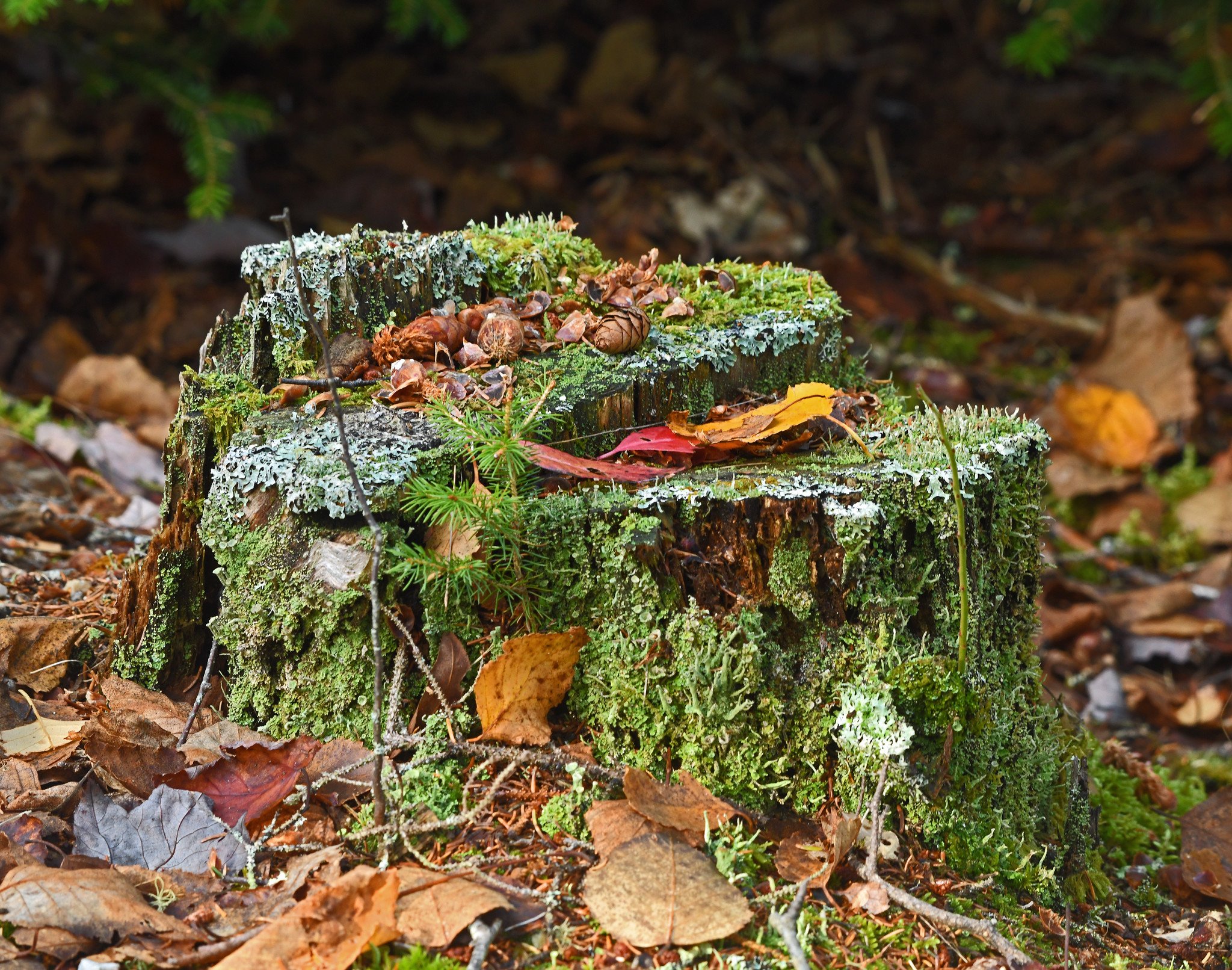 For a flora finale, there were the eye-catching dead and dying leaves and the multi-colored moss, lichen, and fungi, including lonely red viburnum leaves, boastful fothergilla leaves, toasty false chanterelle mushrooms and even marble-like stinkhorn fungi.