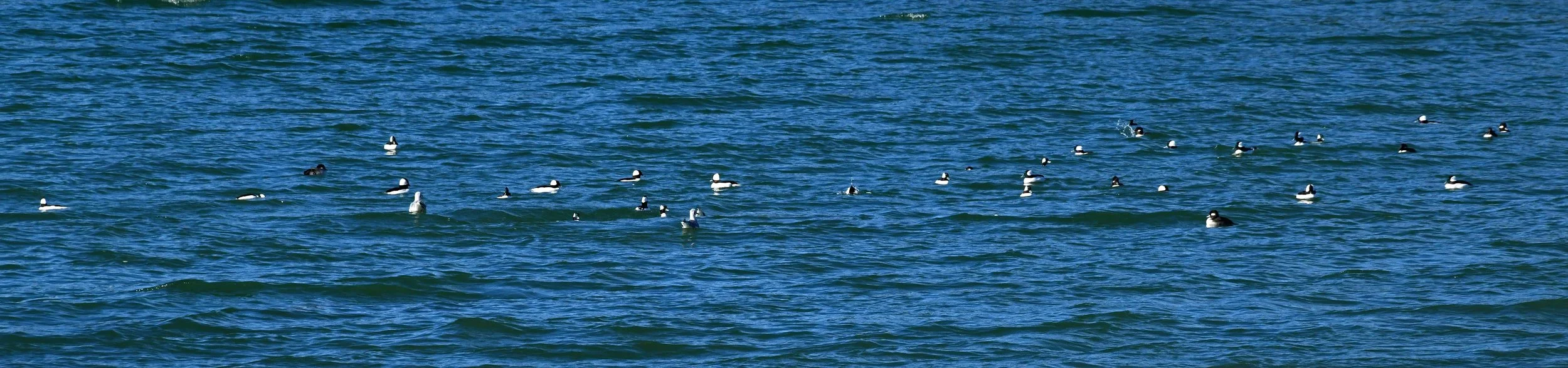 As for feathered fauna, we’re on Route 1 South for Canada geese. They’re mostly overnight tourists that stop for dinner and breakfast, then continue on. On the other hand, we have flocks of waterflowl from Canada that will enjoy our now-boatless coves all winter. They include splashing eiders and content buffleheads.
