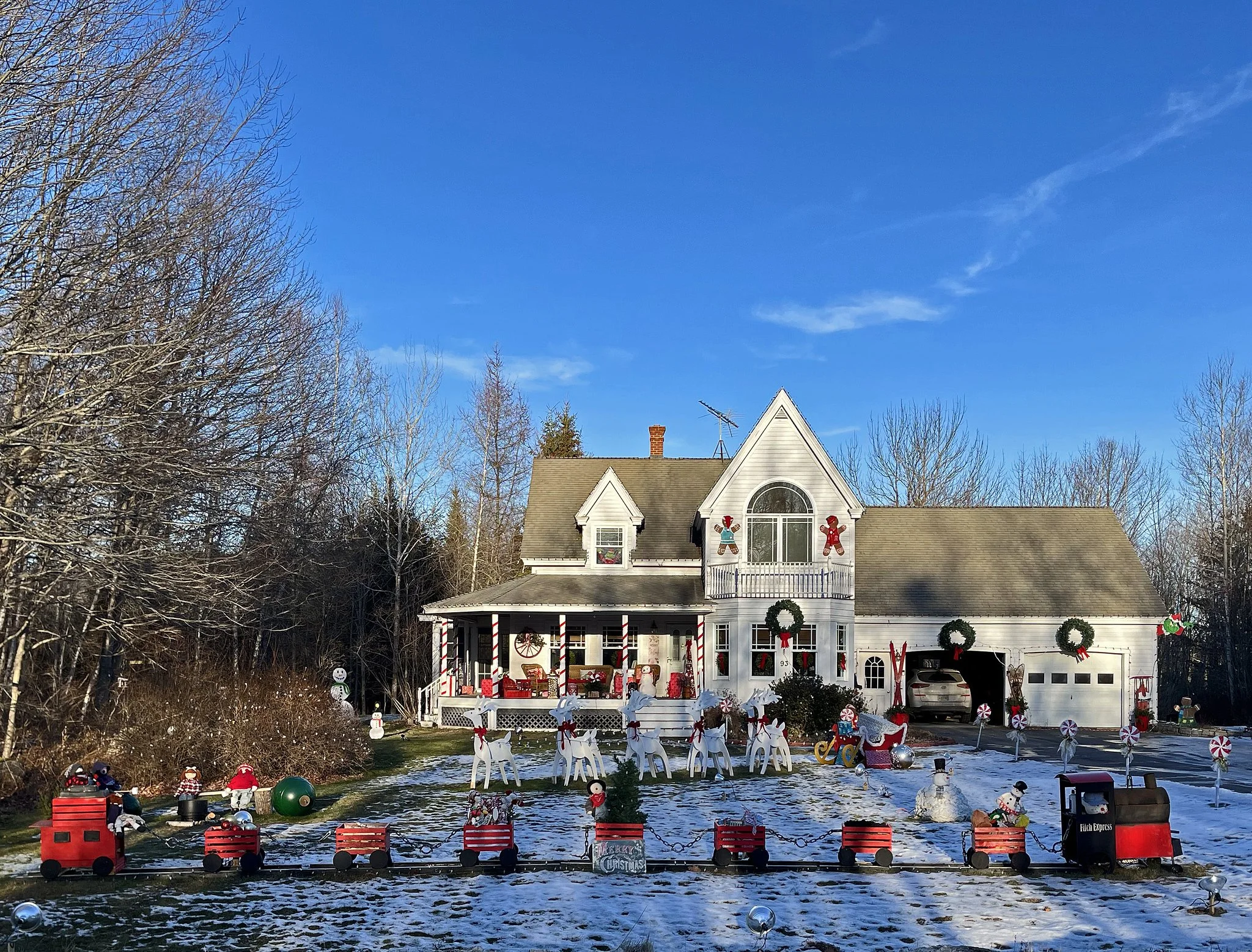 Above, you see a fine old house decorated for the season in what we’ll call the “exuberant style”: a snowman train traveling south; Santa’s reindeer sleigh traveling northwest; massive evergreen wreaths and (I think) huge gingerbread cookies on the house, and much more. It’s a belly-laugh.