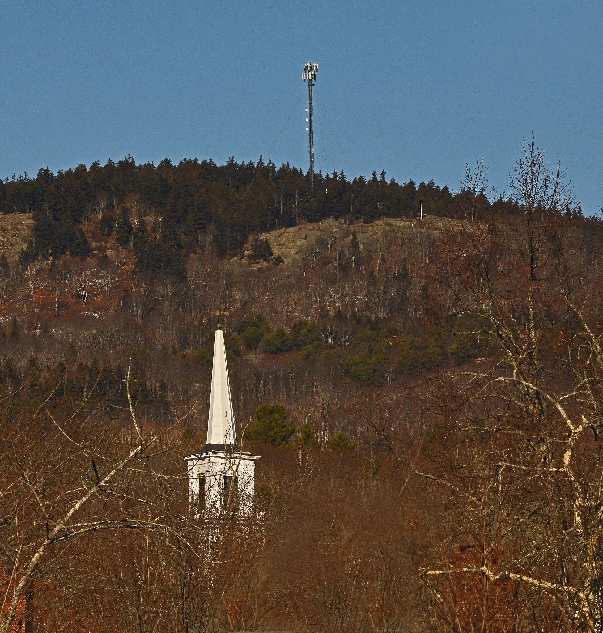A closer look at the summit reveals a communications tower that was put up there in 1981 for transmitters and repeaters and rebuilt later to add cellular service equipment. Ground views of the summit often reveal (as you’ll see) the steeple of the First Congregational Church of Blue Hill, which was built in 1843: