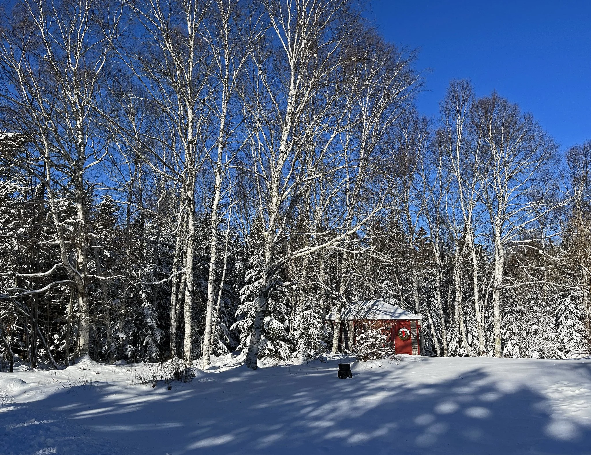 Mother Nature’s Christmas gift has become glazed like fine porcelain. Colorful objects wrapped in the snow pop visually. Old and old-looking red structures are especially eye-catching. Here’s a neighbor’s red-daubed workshop that was built in the early 1900s and reportedly was used to carve wooden decoys for duck hunting, among other things: