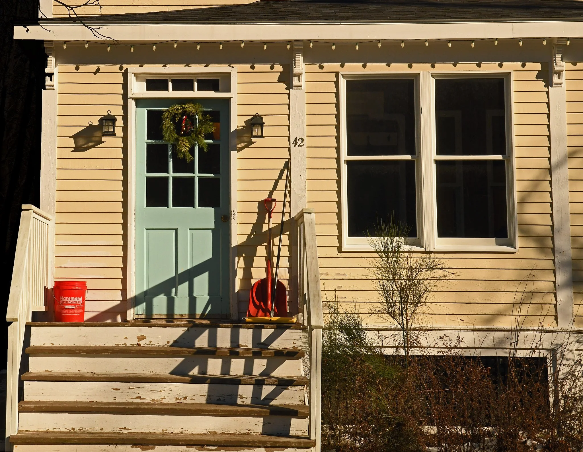 Below you’ll see a more utilitarian and common Down East residential porch with holiday lights, a wreath of greens, and ready-to-use winter paraphernalia: shovel, broom, and bucket (containing ice melt crystals, I suspect). (Note also the intriguing shadows.)