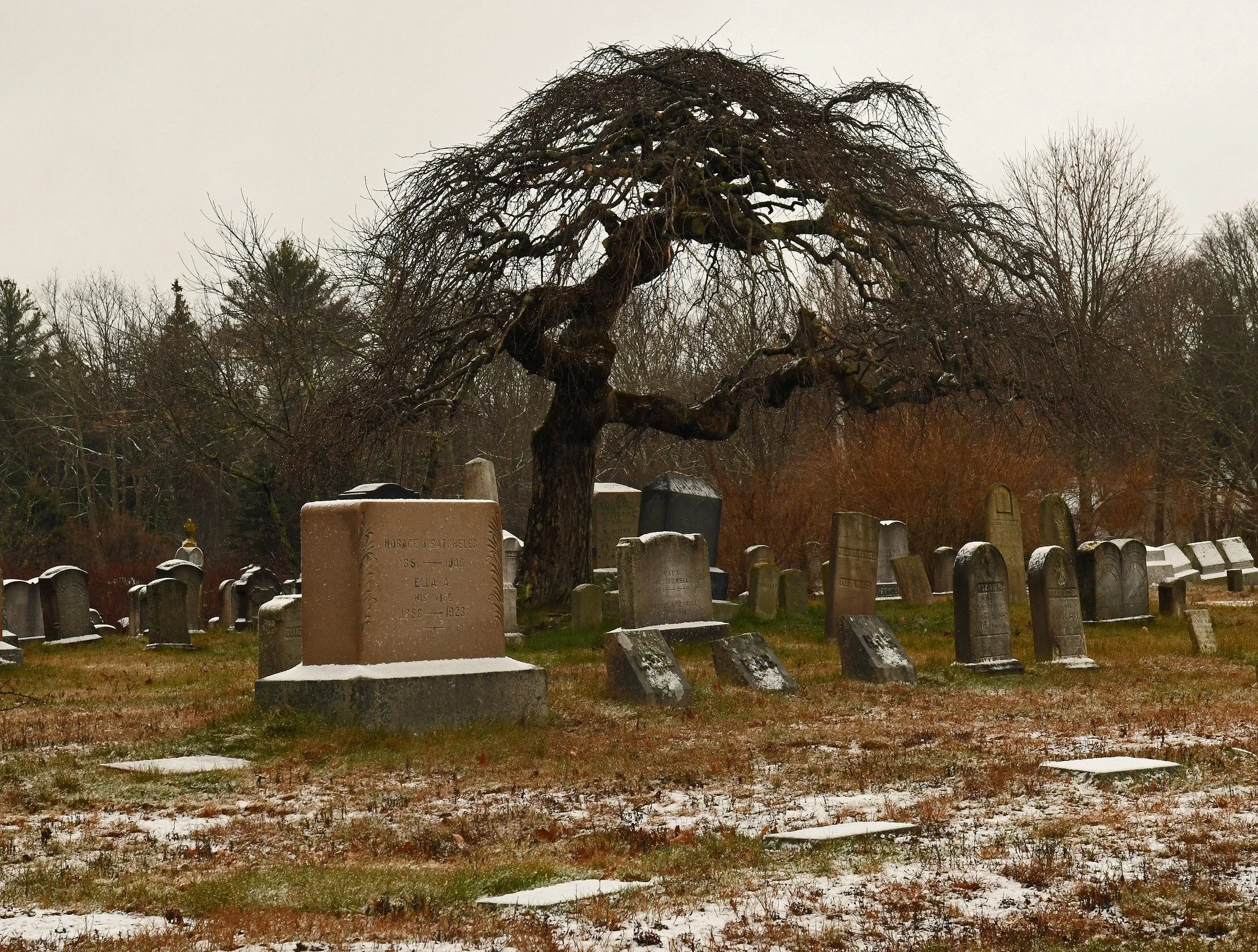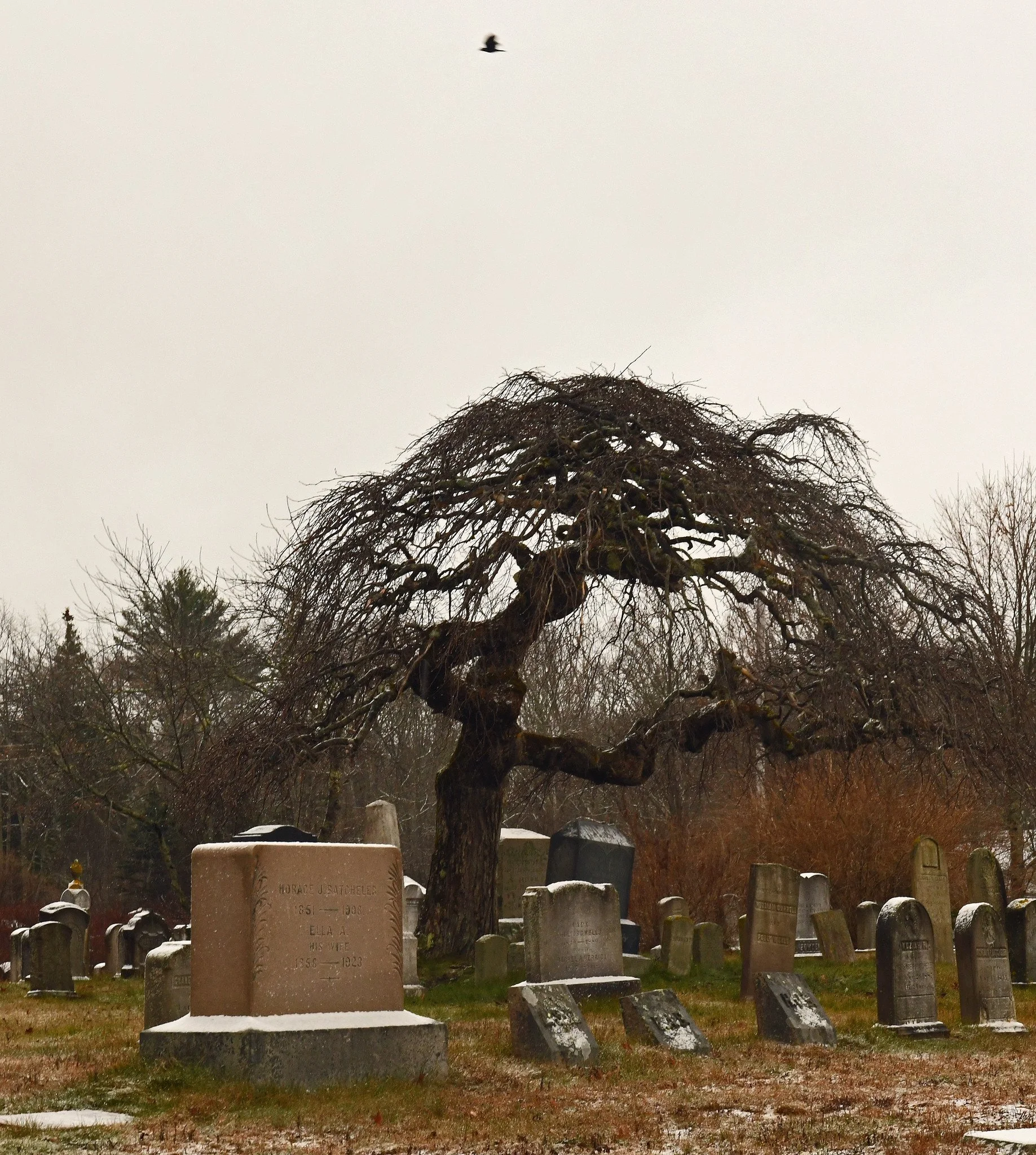 Yesterday, the Camperdown elm stretched her now-bare arms hopelessly, seemingly trying to shelter her assigned souls from a mix of fine snow and rain that was coming out of a silver-gray sky. Overhead, a raven circled high above, a historic sign of the death of a loved one: