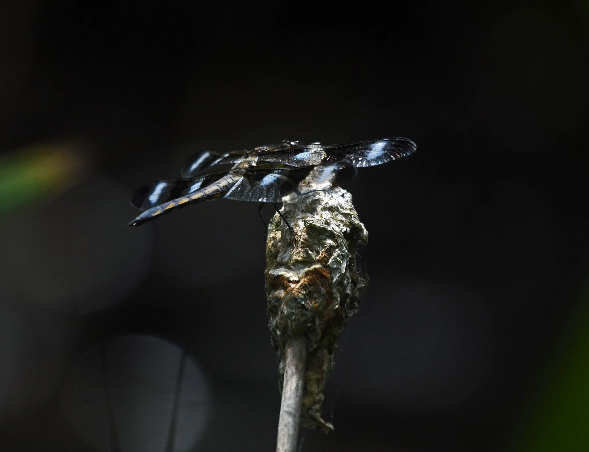It’s high summer and the larger dragonflies are starting to come out. Here you see a male 12-spotted skimmer approaching a cattail head that is his favorite hunting perch. They’re known for their territorial behavior and the trait of returning quickly to their perch after being disturbed.