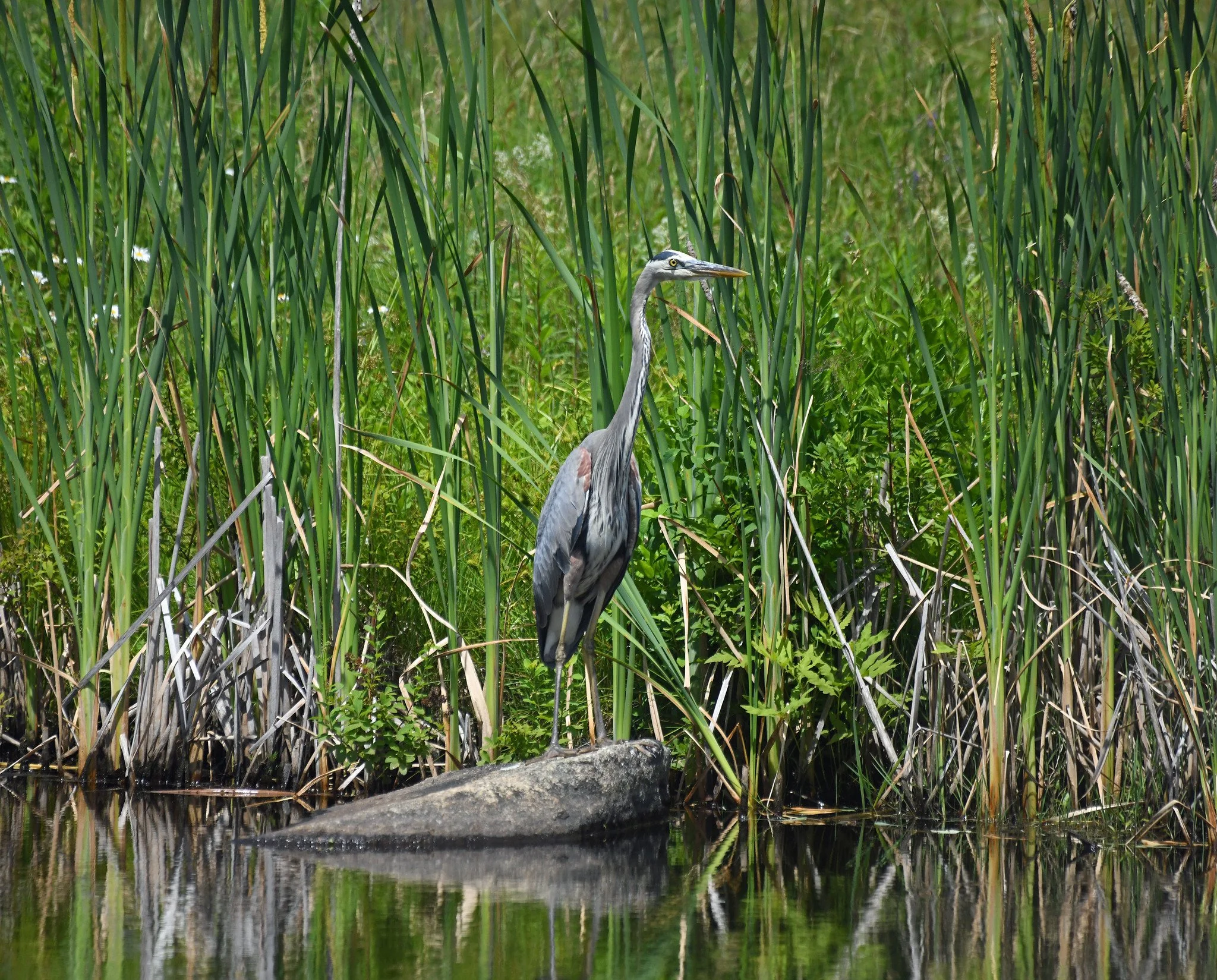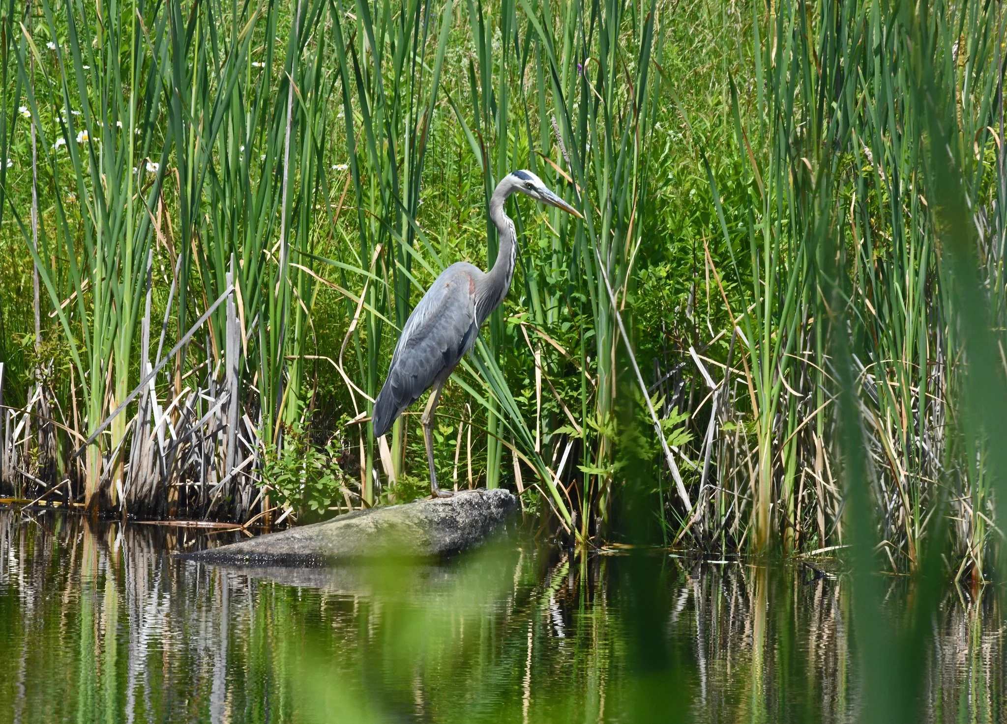 Yes, the suspect is a great blue heron. He and his kind primarily eat fish and there are small fish in these ponds. (They’re mostly common and golden shiners, I think, that apparently have been brought in as eggs in the feathers and intestines of visiting ducks.) The fish attract great blues, which are not very particular about their diets. They’ll eat almost any moving body that they can get their beaks around, including insects, amphibians, reptiles, small mammals, and other birds.