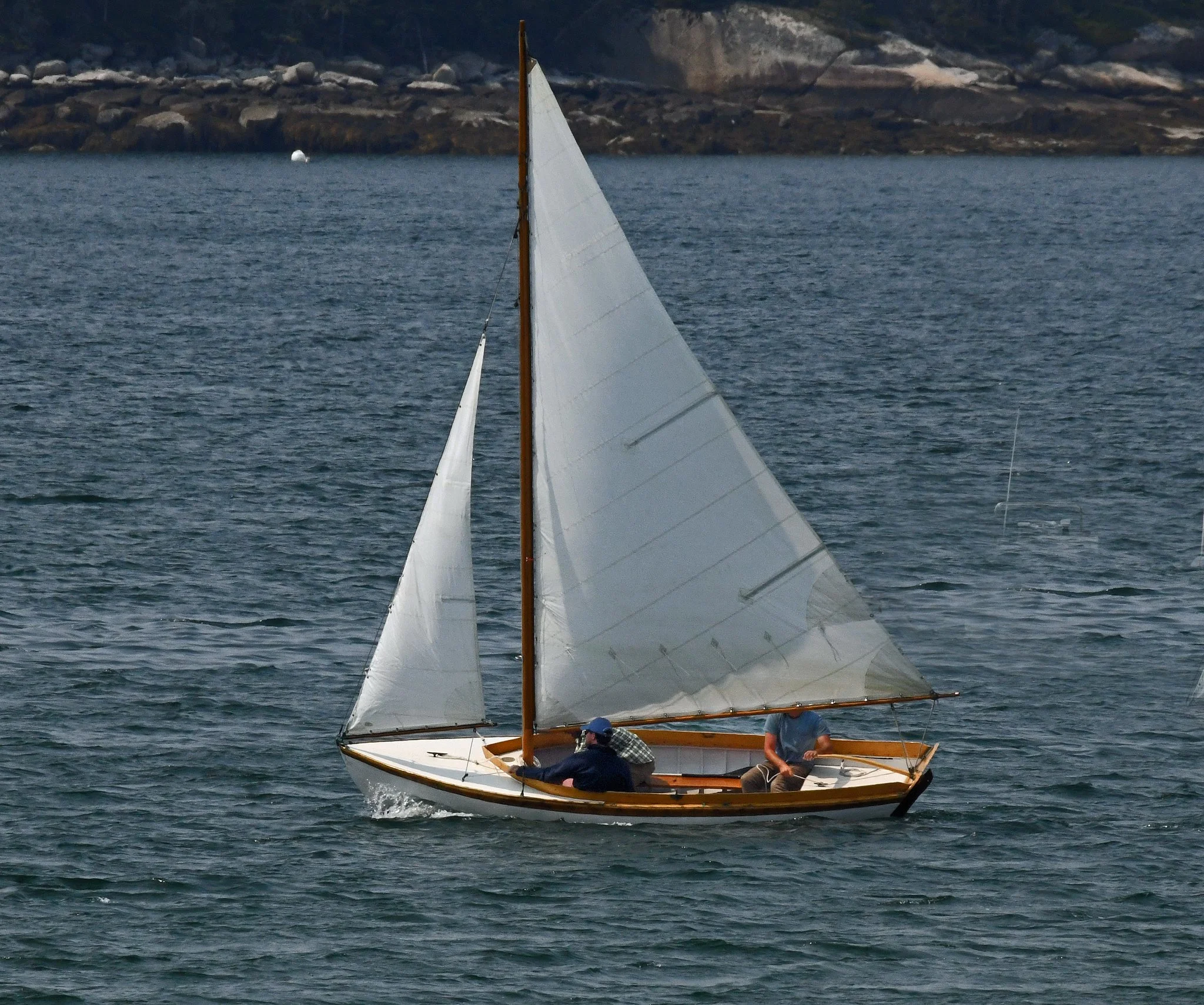 The late Roger Angell came to mind when I saw this small boat sailing in Great Cove recently. I think that it might be SEAL, a “12 ½” (foot at the waterline) Herreshoff used by the WoodenBoat School to teach sailing.