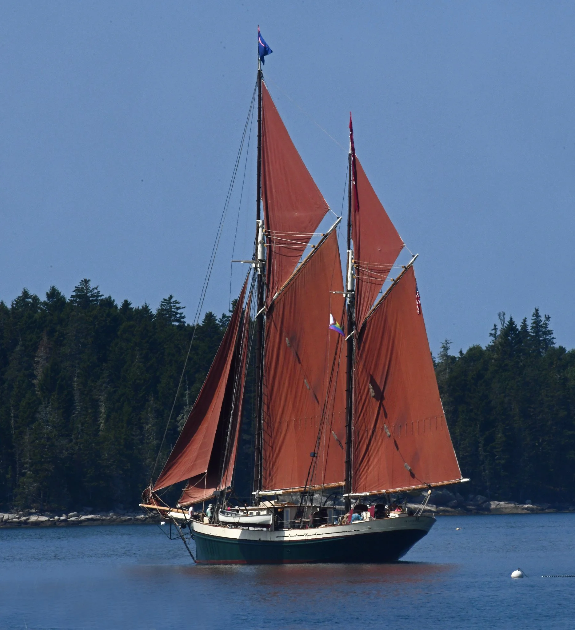 Here you see the 130-foot ketch ANGELIQUE in Great Cove Monday, where she overnighted. In this image, she’s just weighed anchor and is wheeling around to sail north (to your right) into Eggemoggin Reach, but there was a problem.