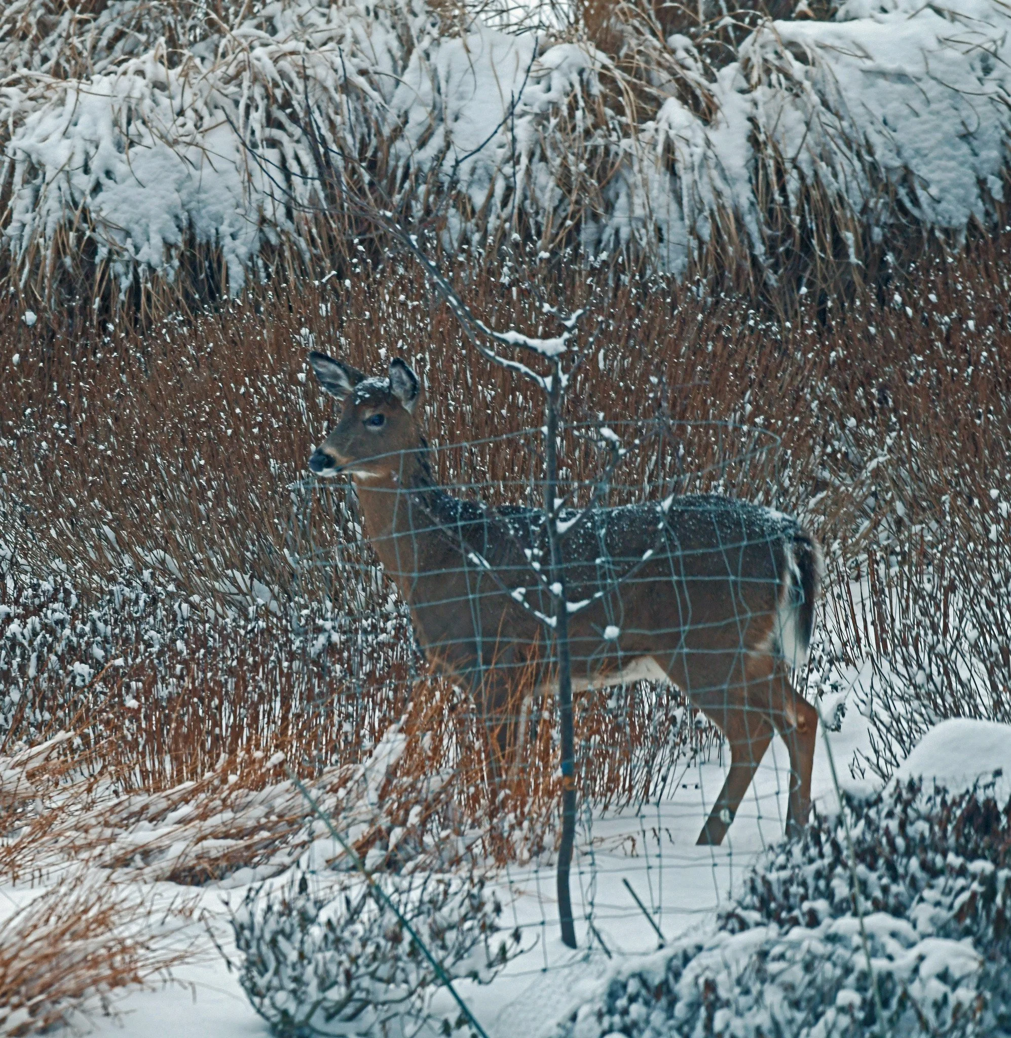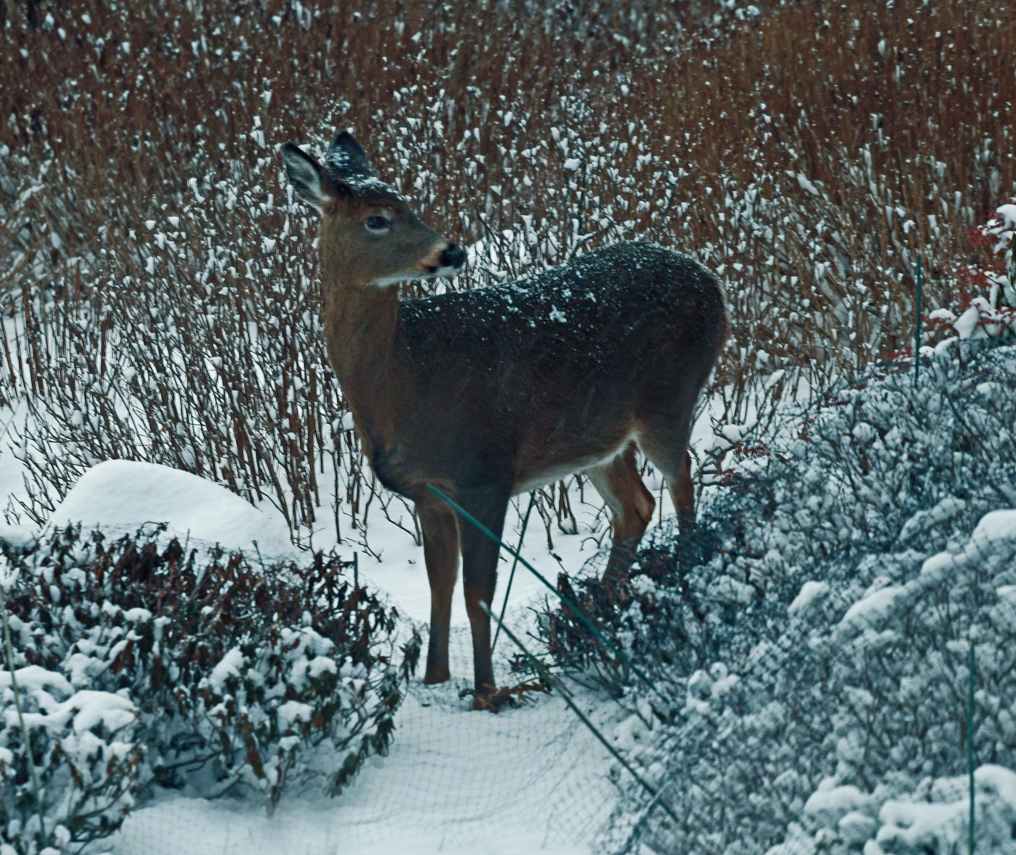 Although the snow has brought us more delight than damage, it seems to have caused some difficulties for our white-tailed deer, which have been trying to breach the deer barriers in our front garden: