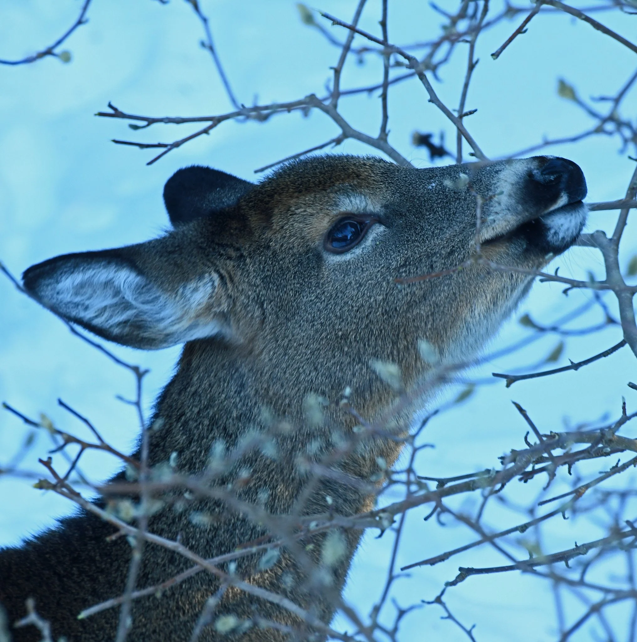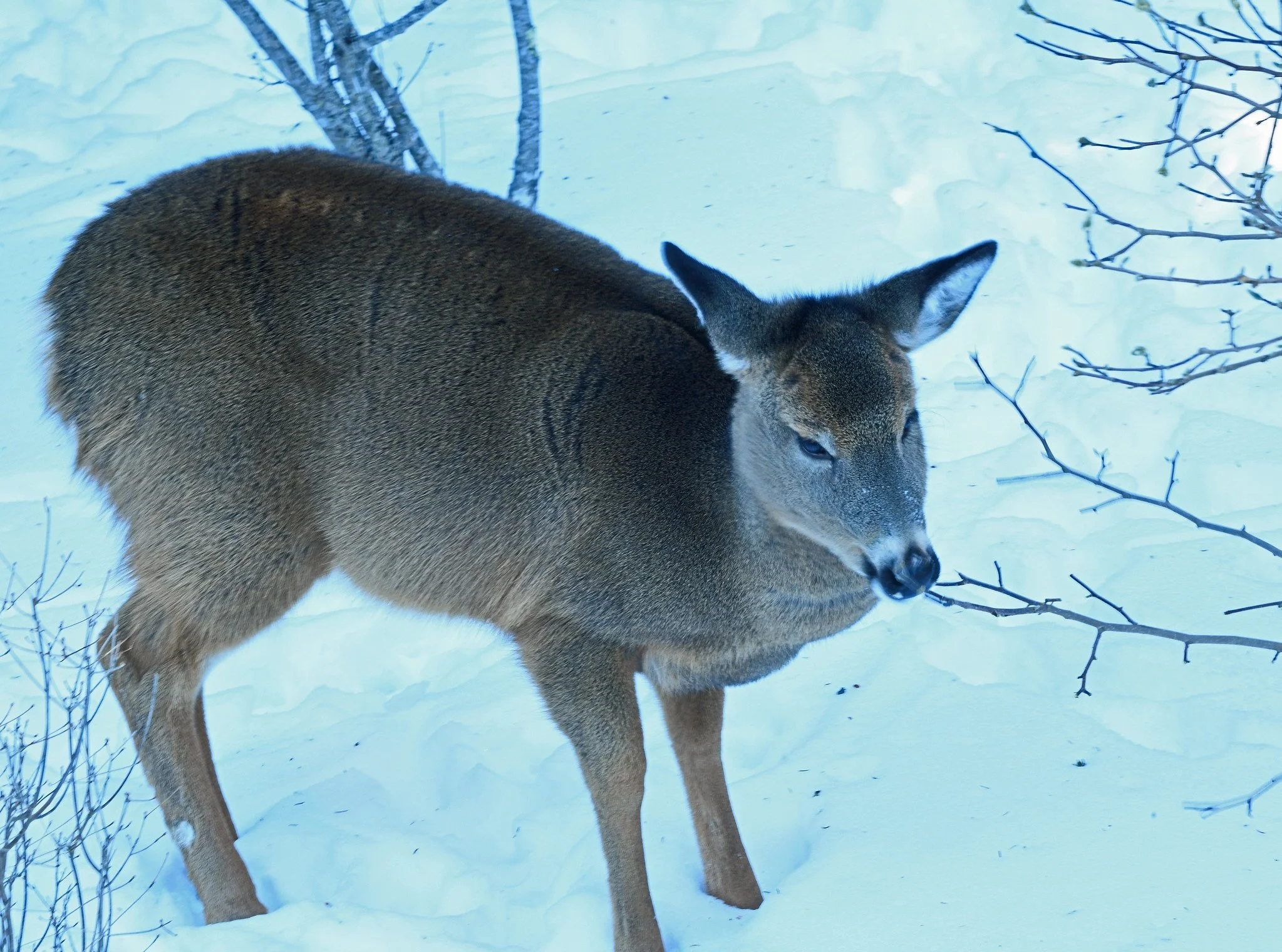 Here you see a white-tailed deer browsing on the branch tips and terminal buds of a star magnolia bush in freezing temperatures early yesterday. It’s probably not this yearling’s favorite meal, but she can’t be choosy during the kinds of cold winter spells that we’ve been having.