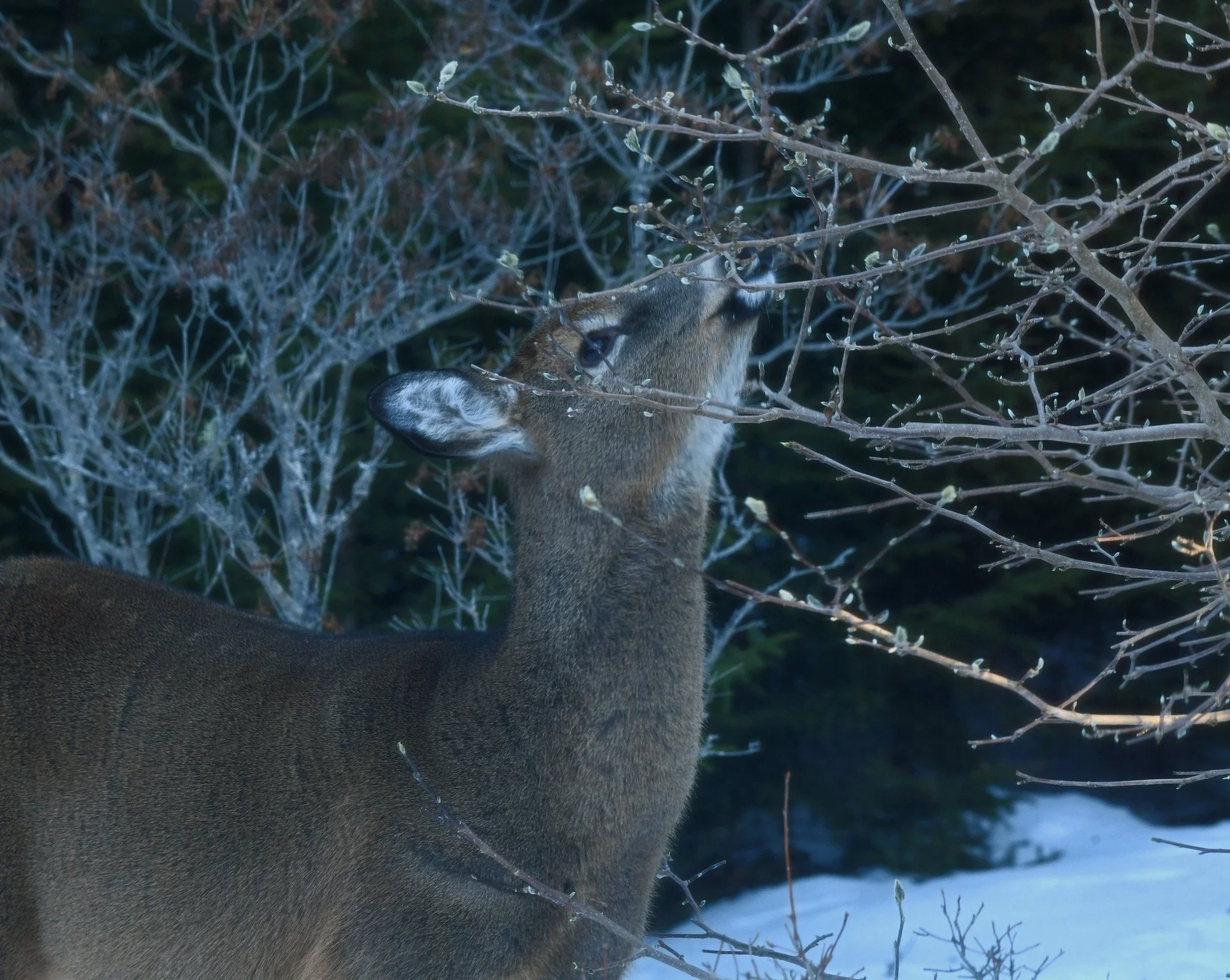 Lately, many of our deer have limited their movement and “yarded up” much of the time in communal deer yards within stands of dense, wind-breaking coniferous trees. We still have somewhat deep, frozen snow that hinders their movement, makes it harder for them to avoid predators, and covers their best food.
