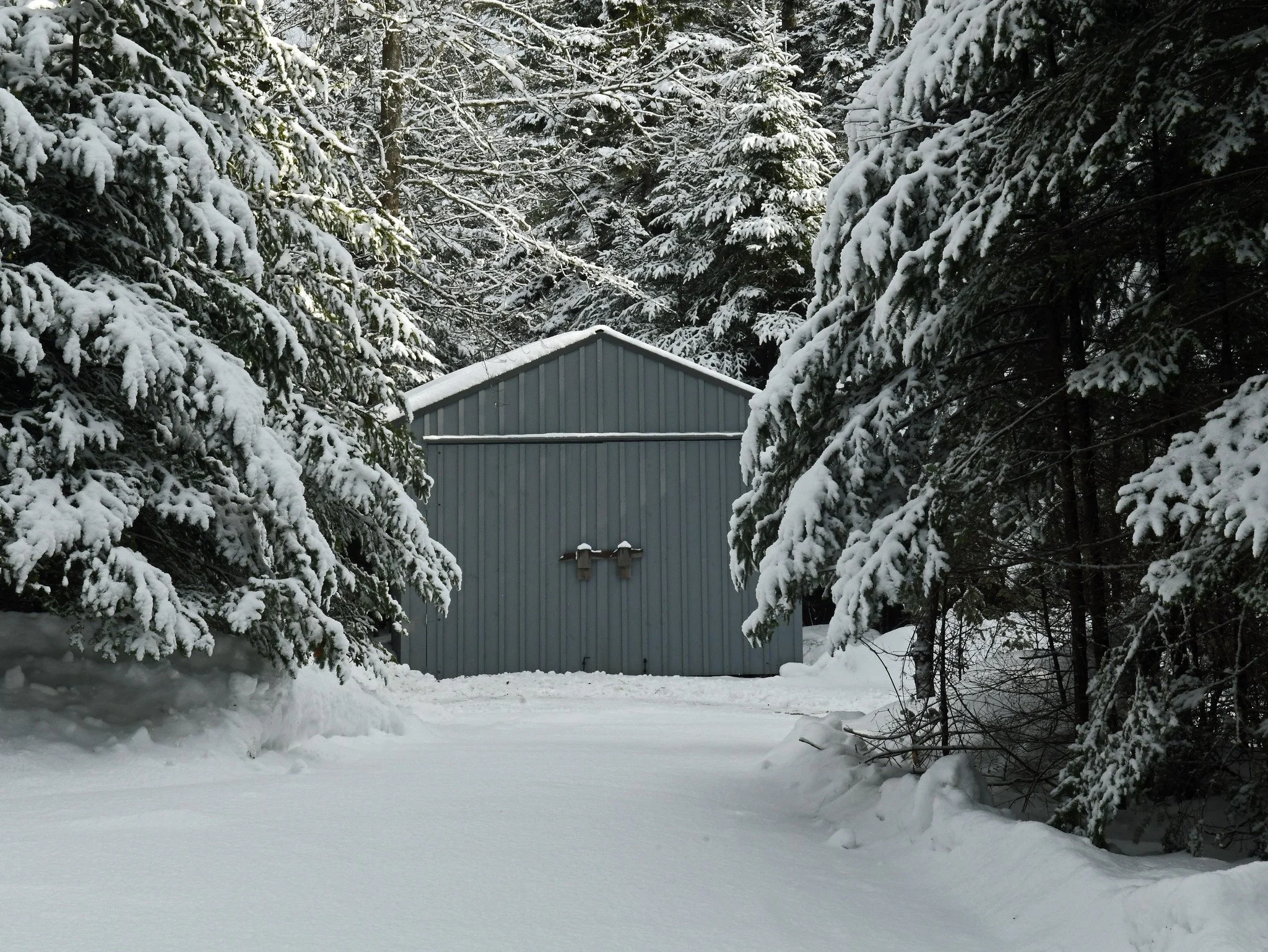 Below, you’ll see a little gray boat shed that seems to like hiding among a crowd of big, tough spruce trees. That shed was built in 2024 by a neighbor to store a small trimaran in winter.