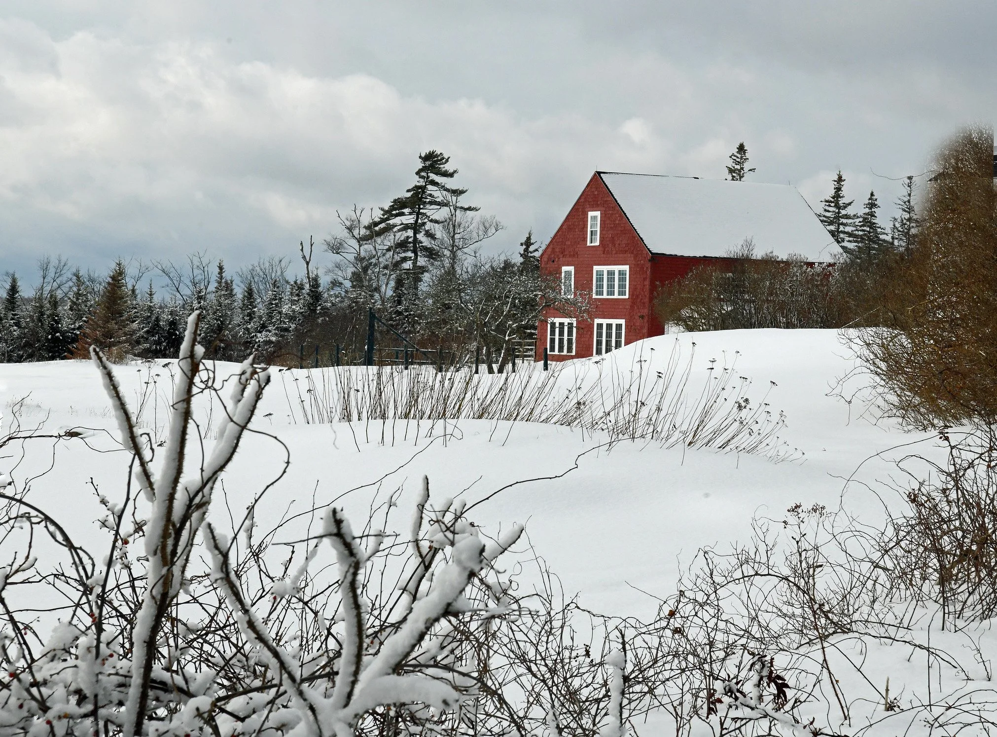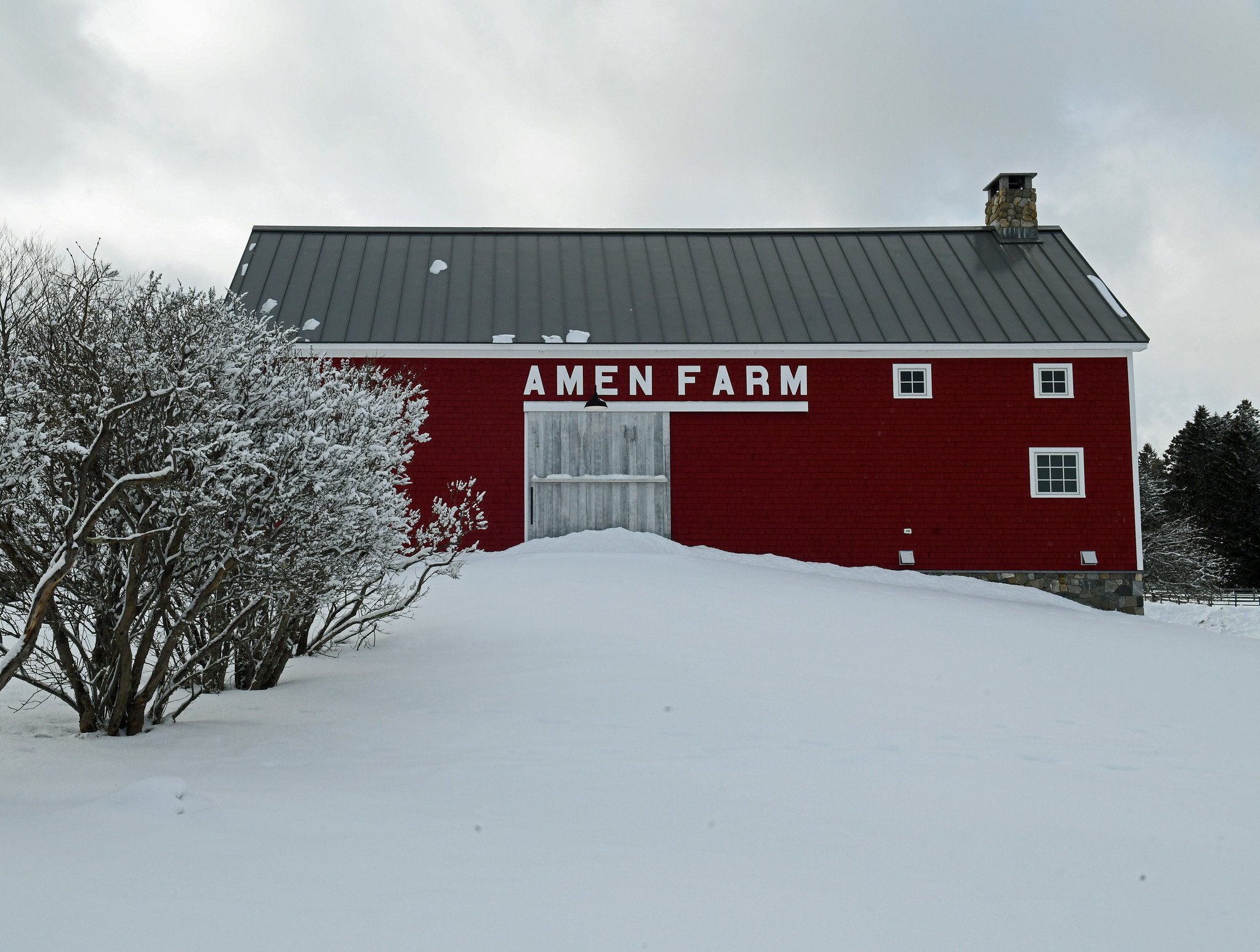 Continuing with our Fantastic February Snow series: Above and below are old red barns that have been converted into new living spaces and that look great in snow.