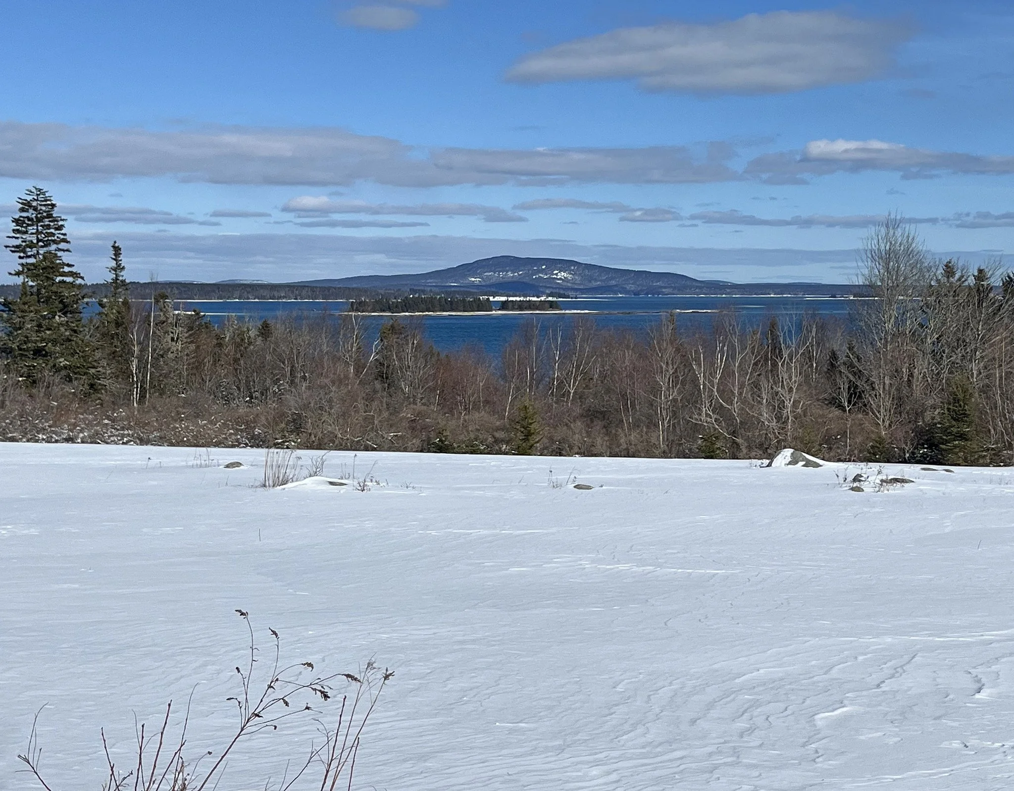 When the sun greeted the Blizzard’s new snow yesterday, a beautiful tranquility was restored. Below, you’ll see the long view to Mount Desert Island from Brooklin’s Amen Ridge. yesterday, as well as the scene (and perhaps the sense) of what it was like in a stand of spruce trees with dappled new snow all around.
