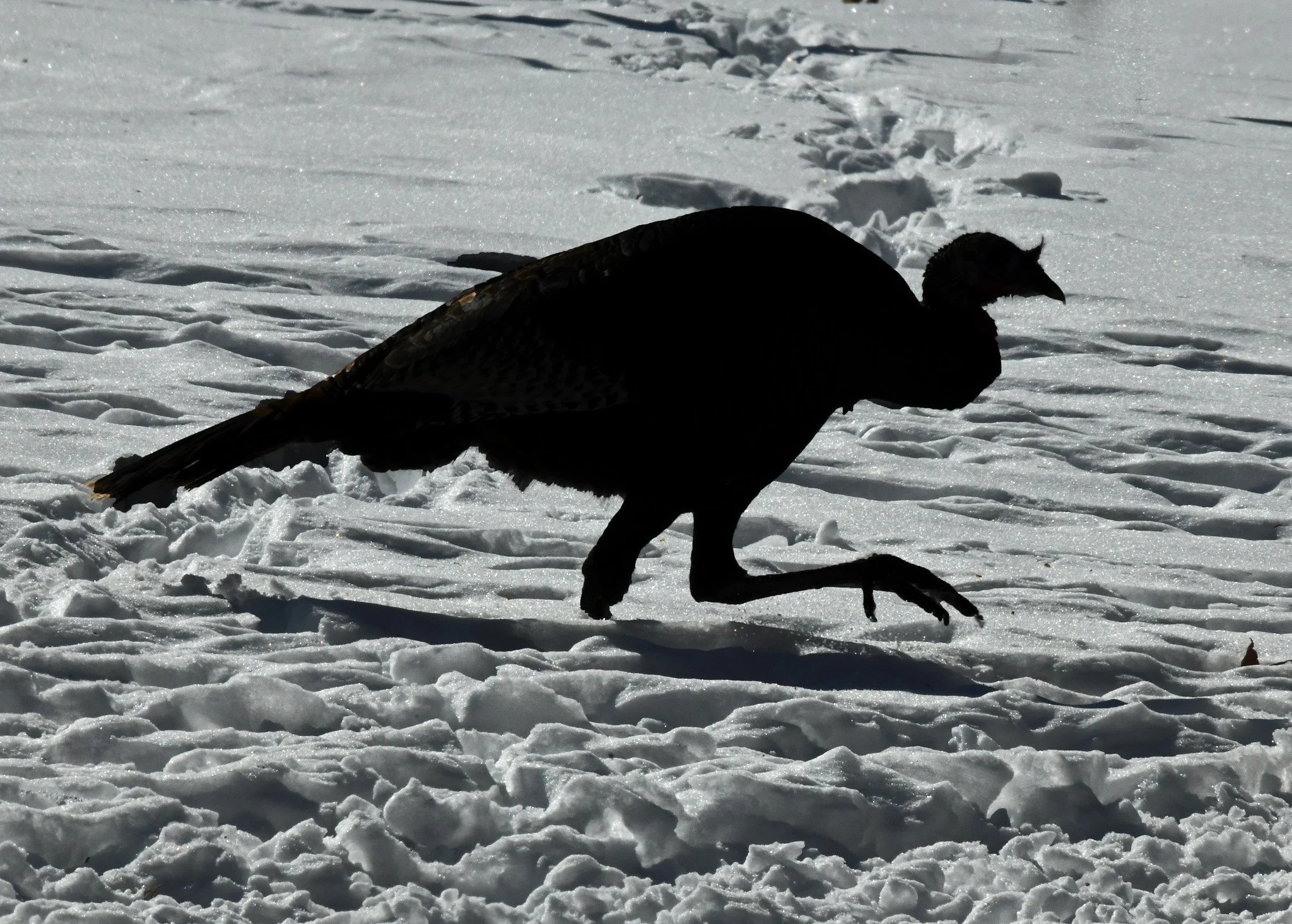 Pity the wild turkeys that have to high-step slowly through snow. These birds walk on their clawed toes rather than their shanks (feet) and keep at least one foot on the ground when they travel on the ground. They bend their legs in the middle at what looks like a knee, but really is an intertarsal joint (ankle). On solid ground, they can run up to 18-25 miles an hour; in snow, they creep.