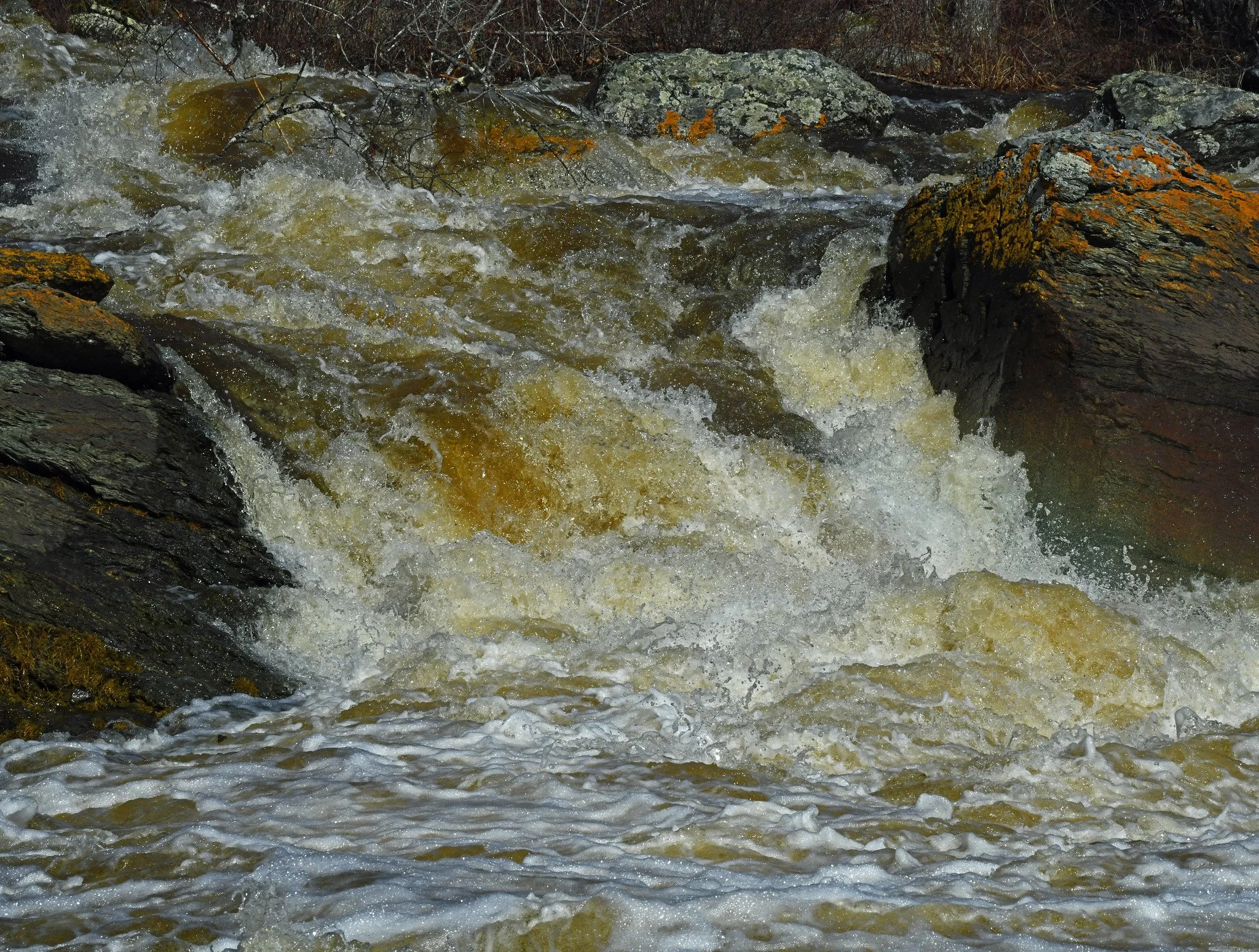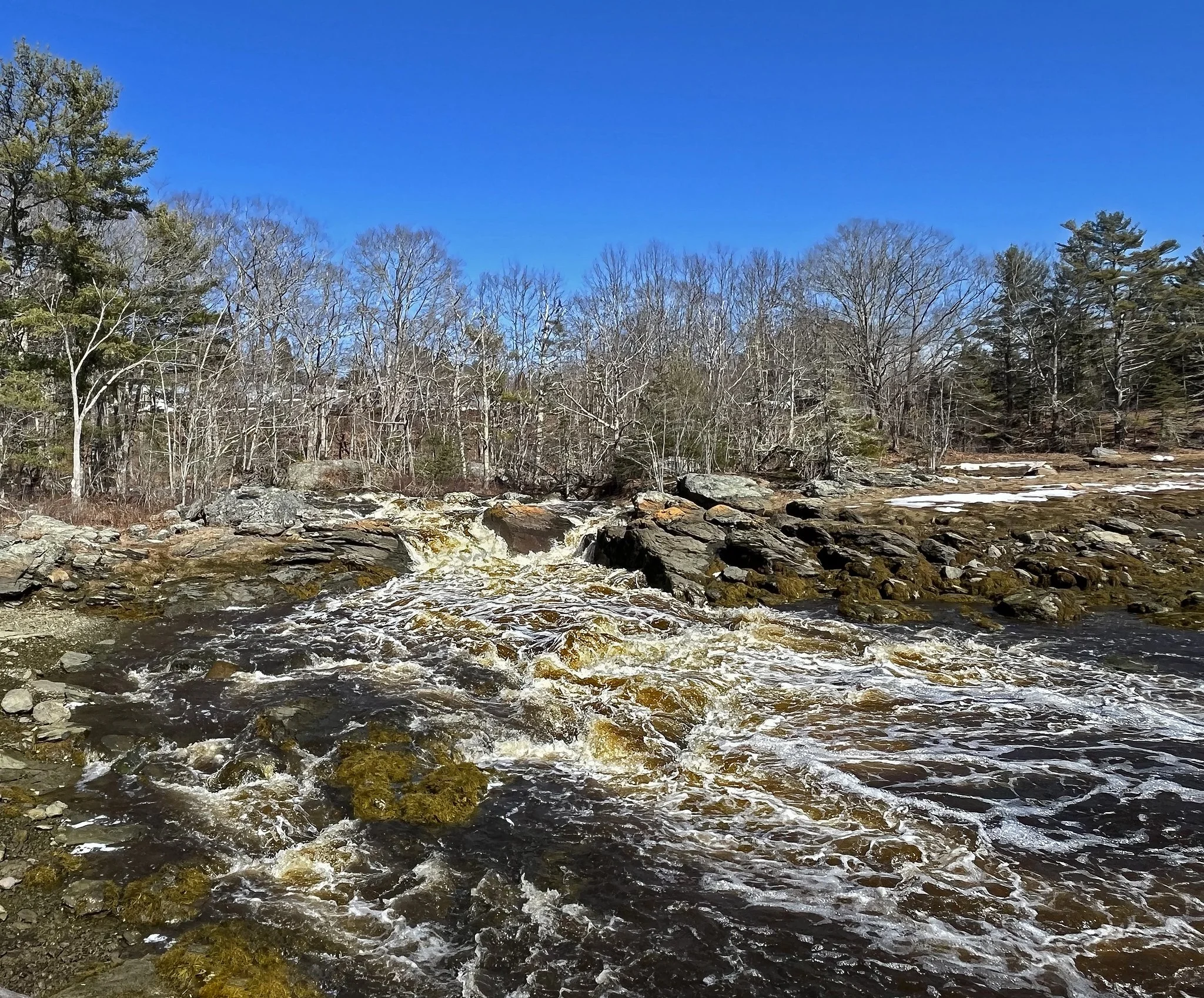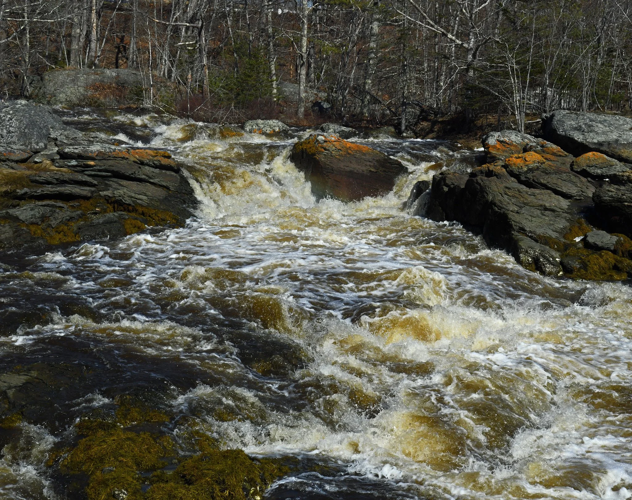 Here you see the mouth of Patten Stream at Patten Bay yesterday. The swollen and turbulent stream is forcefully ejecting the run-off water from the torrential rains of March 16-17. This phenomenon is akin to the vomiting of excesses, and it demonstrates one of the problems causing our long-term severe drought.