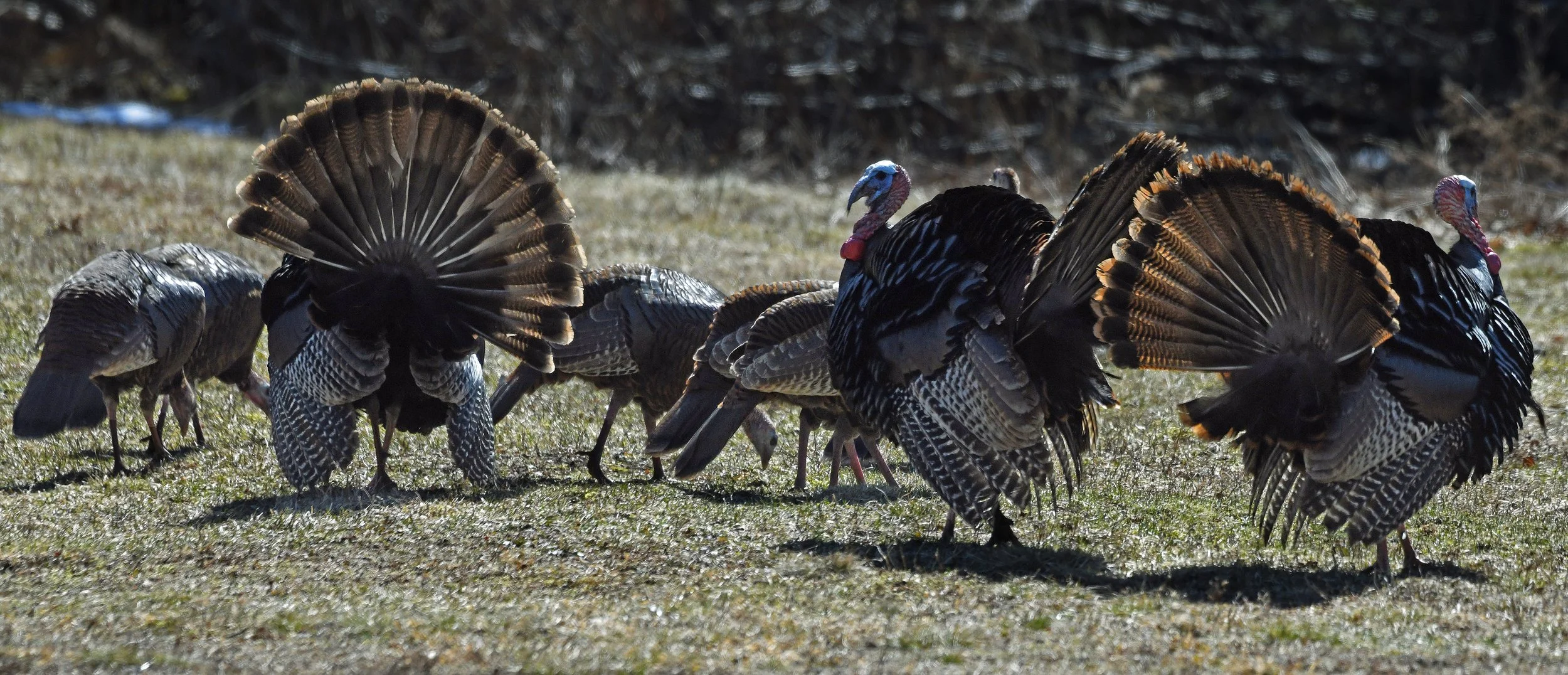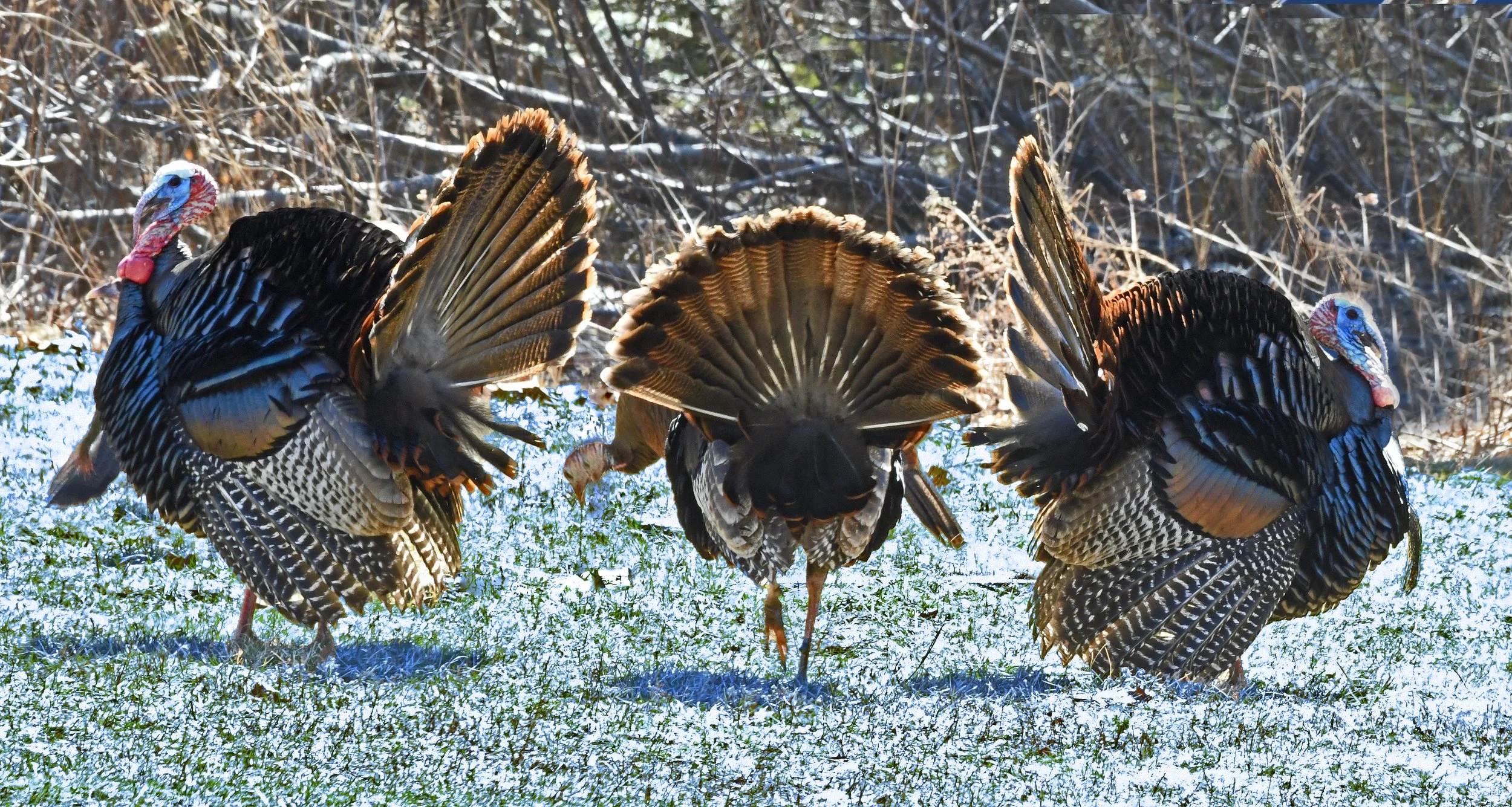 As you’ll see below, Toms around here have gotten their spring testosterone spike and are now performing the wild turkey strut. This performance is one of the most complicated and strenuous displays in the animal kingdom.