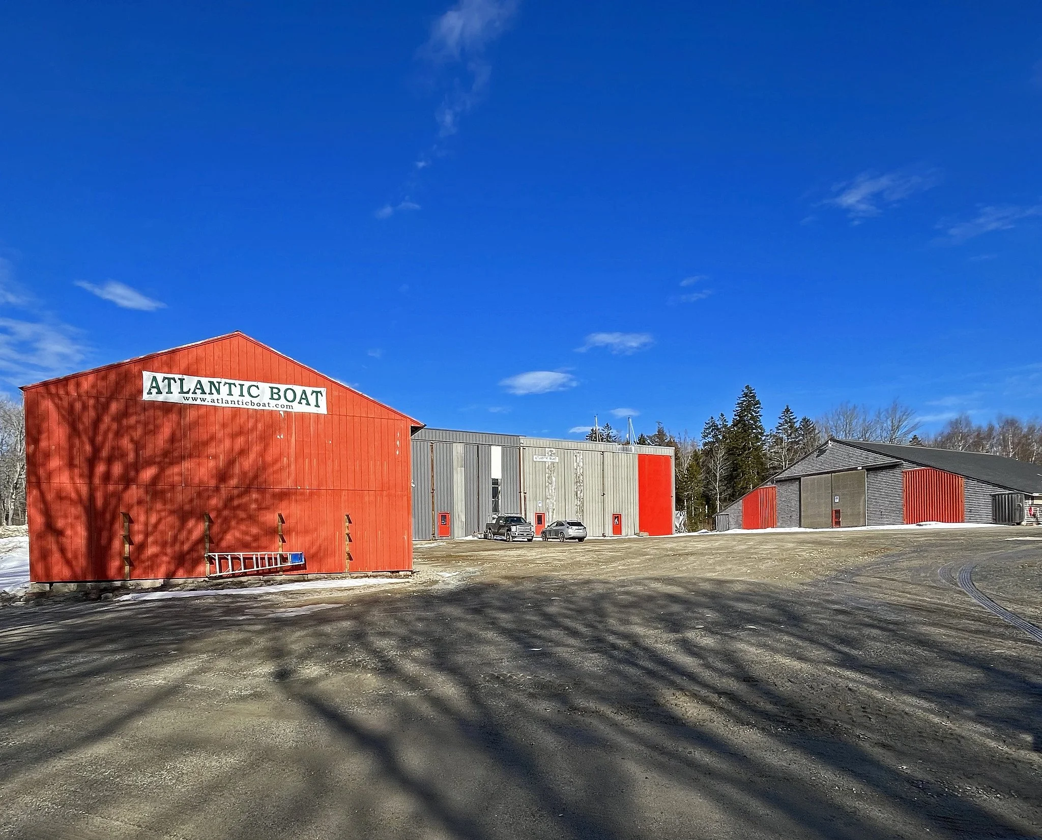 Below, you’ll see some of the heated storage and work buildings of Brooklin’s Atlantic Boat Company. Some of these building doors are 28 feet high to accommodate tall sailboats and flybridge cruisers without removing masts, Bimini tops, or hardtops. ABC designs, builds, maintains and repairs fiberglass Down East-style lobster boats, commercial vessels, and yachts.