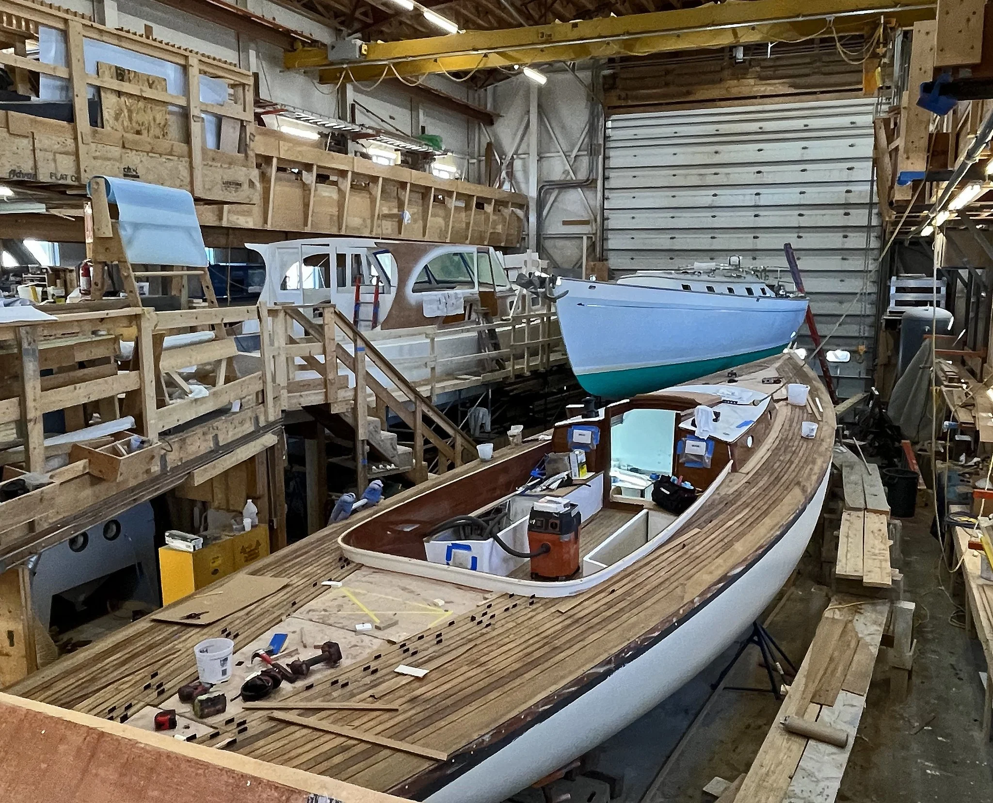We’ve been following the creation of DYLAN, the Brooklin Boat Yard-designed boat in the foreground of the above image of BBY’s main shop. She seems to be coming along nicely. By summer, DYLAN will be an exquisite Eggemoggin 47+ (overall length 47’6”), the third such racing sailboat in that class.
