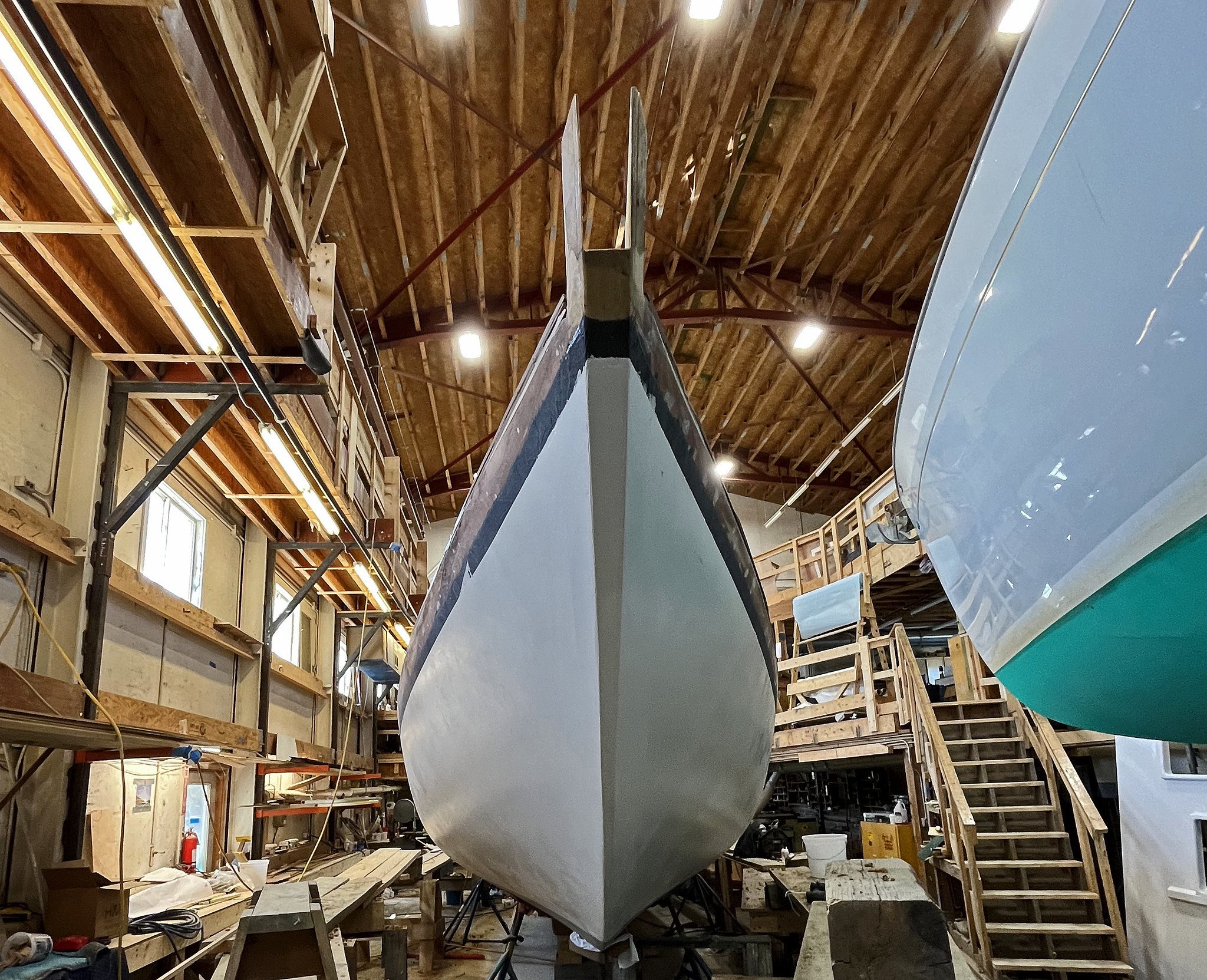Being created to the left of ZINGARA is a 47’ Express Cruiser designed by BBY, a sleek power boat that apparently hasn’t been named yet. She also seems to be coming along nicely. She’s in line to be completed soon after DYLAN. See also the image of DYLAN’s graceful bow: