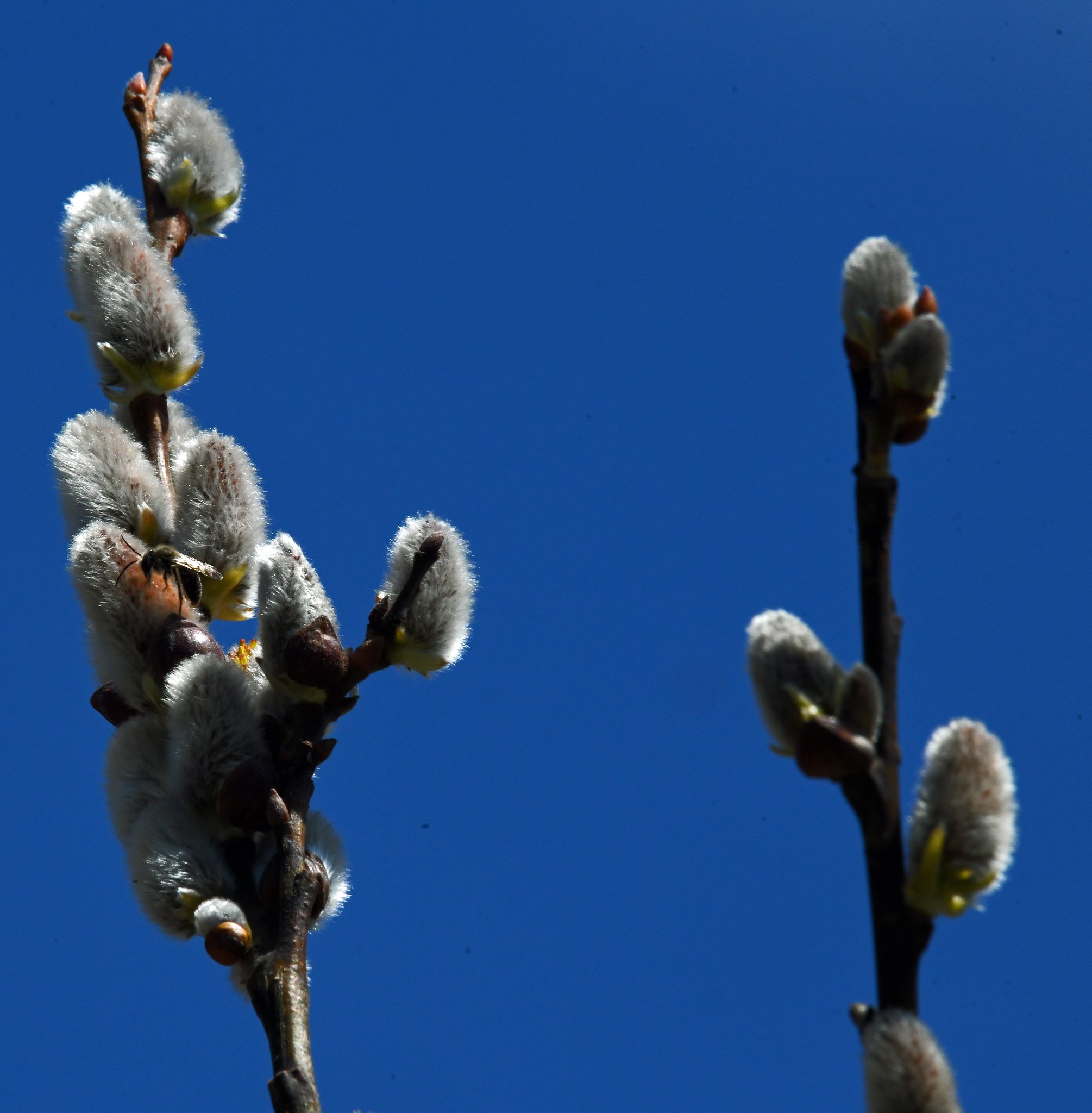 Pussy willow catkins are profuse now on Salix discolor shrubs. They’re beneficial to our earliest pollinators, one of which (a mining bee?) can be seen in this image by those with sharp eyes:
